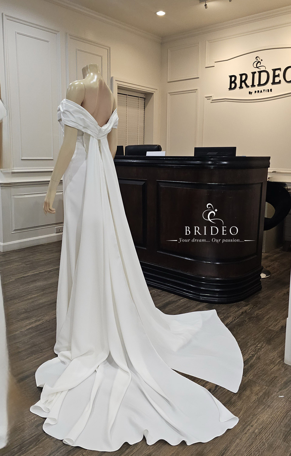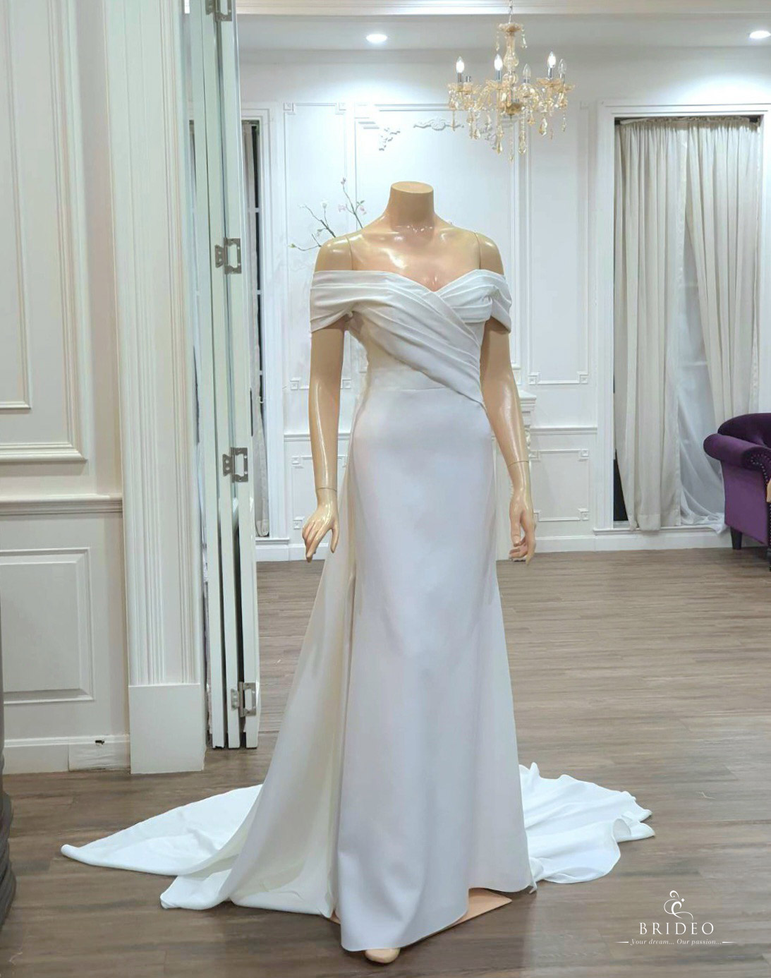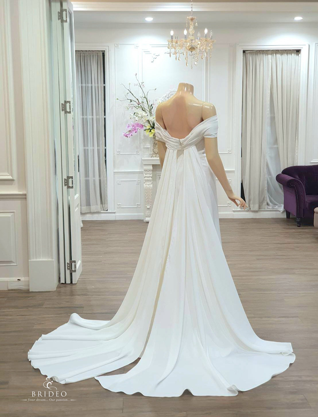 ชุดแต่งงานเนื้อผ้าหรู บรรจงจับเดรปลำตัวและแขนปราณีตงดงาม พร้อม detail ด้านหลังสยายพริ้วไหว เพิ่มความประทับใจน่ามองรอบตัว (แนะนำเจ้าสาวไหล่สวยแต่มีความกังวลต้นแขน สามารถเลือกปกปิดและอวดในจุดที่ต้องการ)