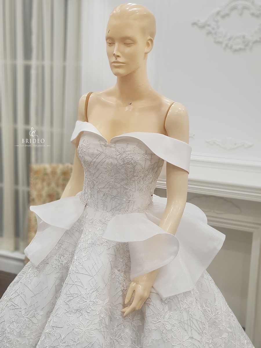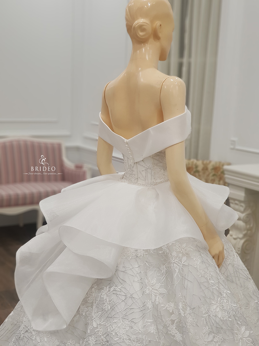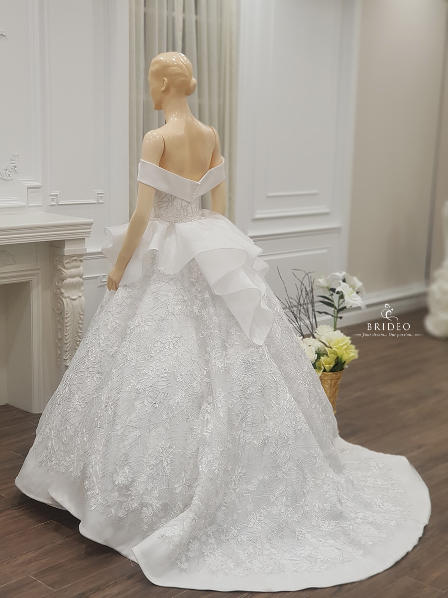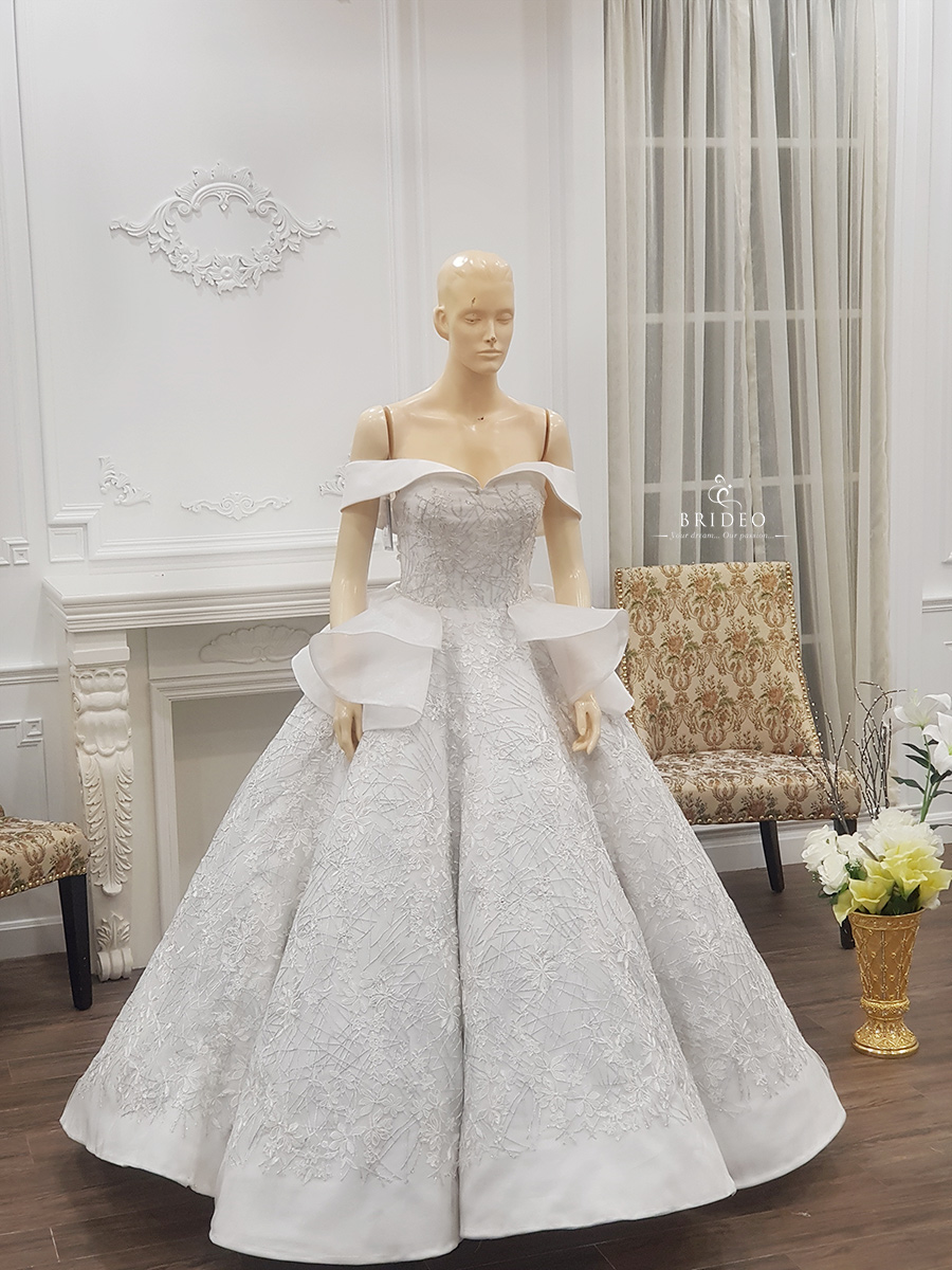 ชุดแต่งงานทรง ball gown ลูกไม้หรู ลุคเจ้าหญิงใส ๆ อ่อนเยาว์ ชุดเช่าพร้อมบริการปรับ size ปราณีต