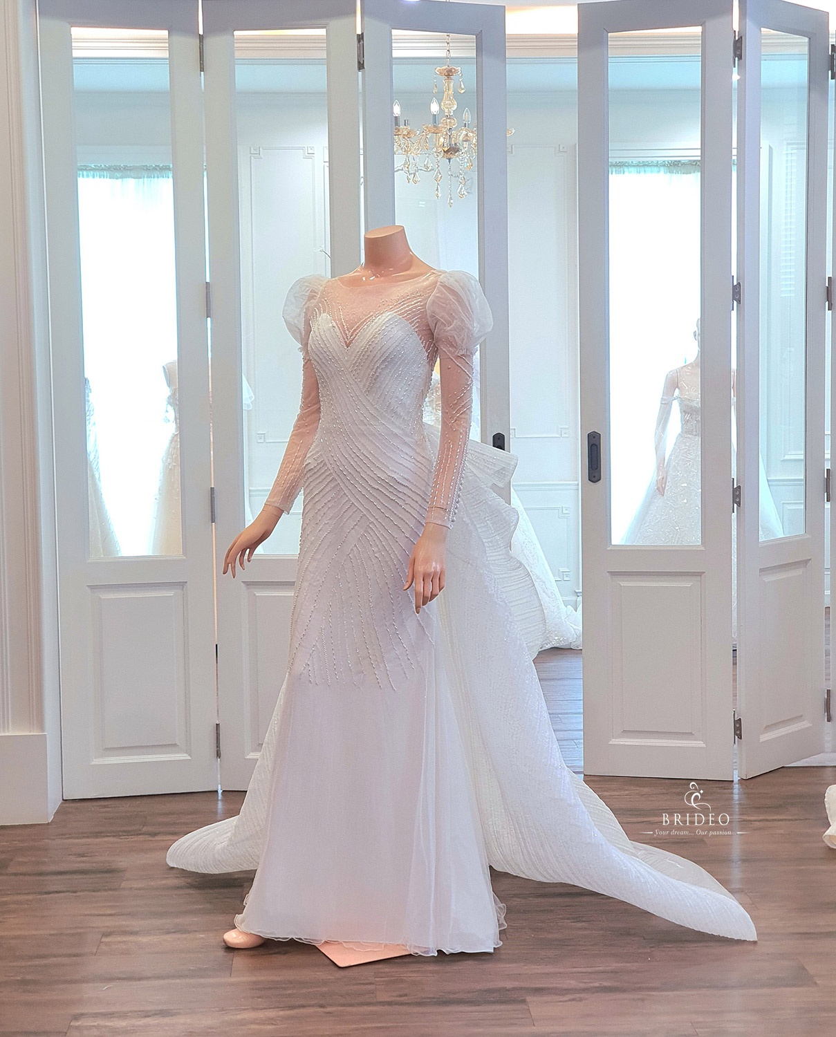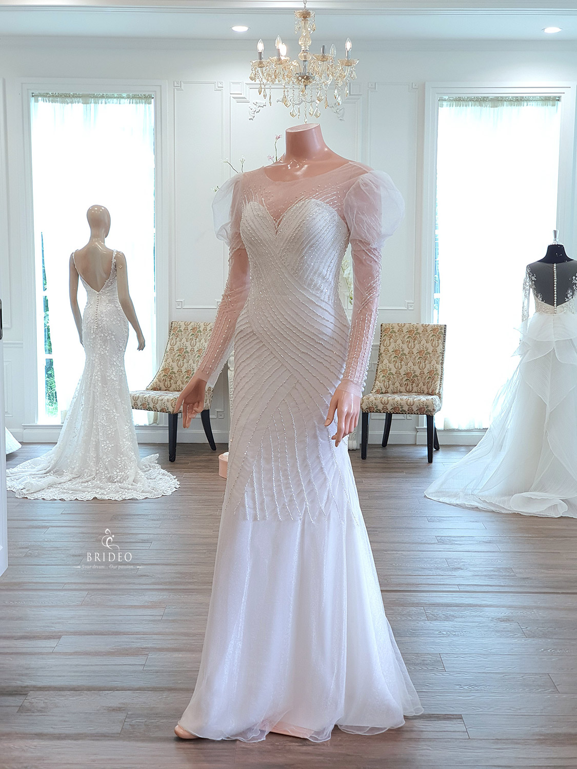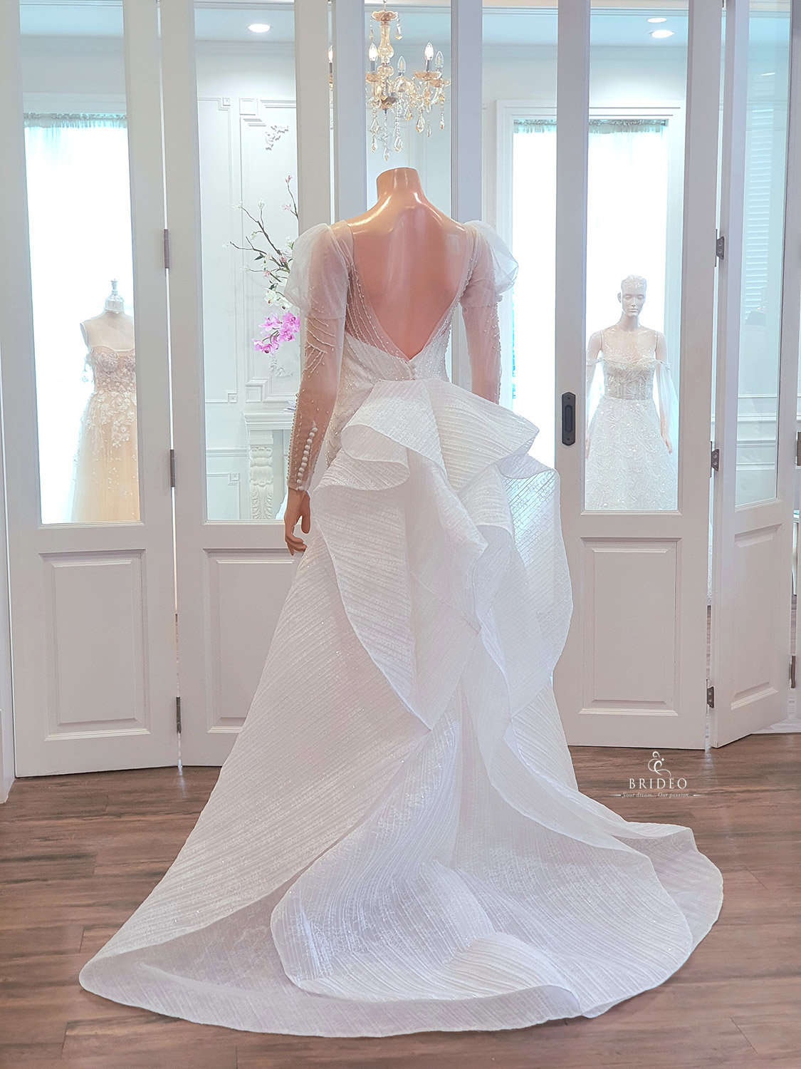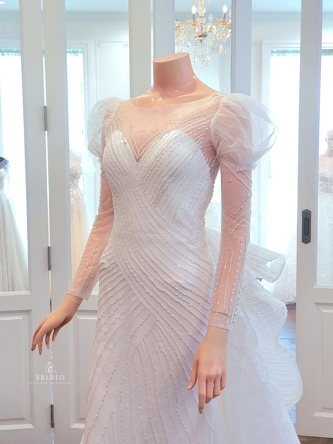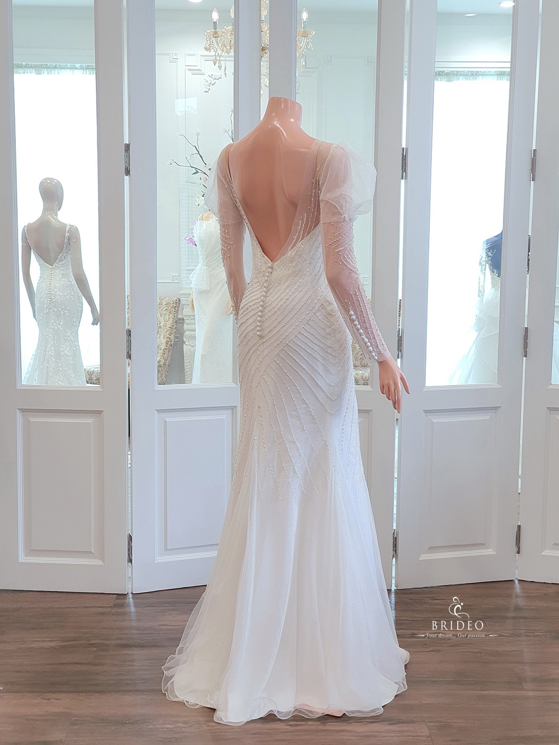 ชุดแต่งงานเข้ารูปหรูแขนยาวน่ารัก เขียนลายแล้วบรรจงปักมือด้วยเลื่อมสวยคุณภาพสูงบนผ้า tulle เนื้อประกาย สวยวิ้งวับอวดหลังเรียว สามารถใช้กับงานแต่งงาน theme สวนสวย เคลื่อนไหวทักทายแขกเหรื่อคล่องตัว และ สามารถเพิ่ม detail ติดหางฟรุ้งฟริ้งเพื่อใช้กับงาน indoor ได้
