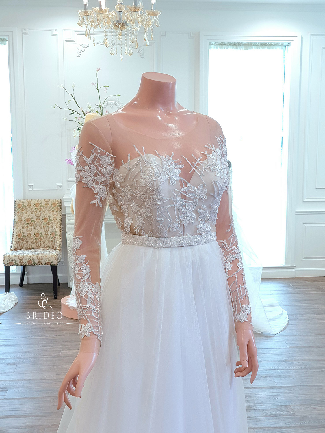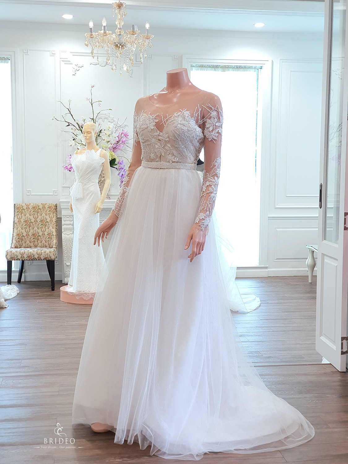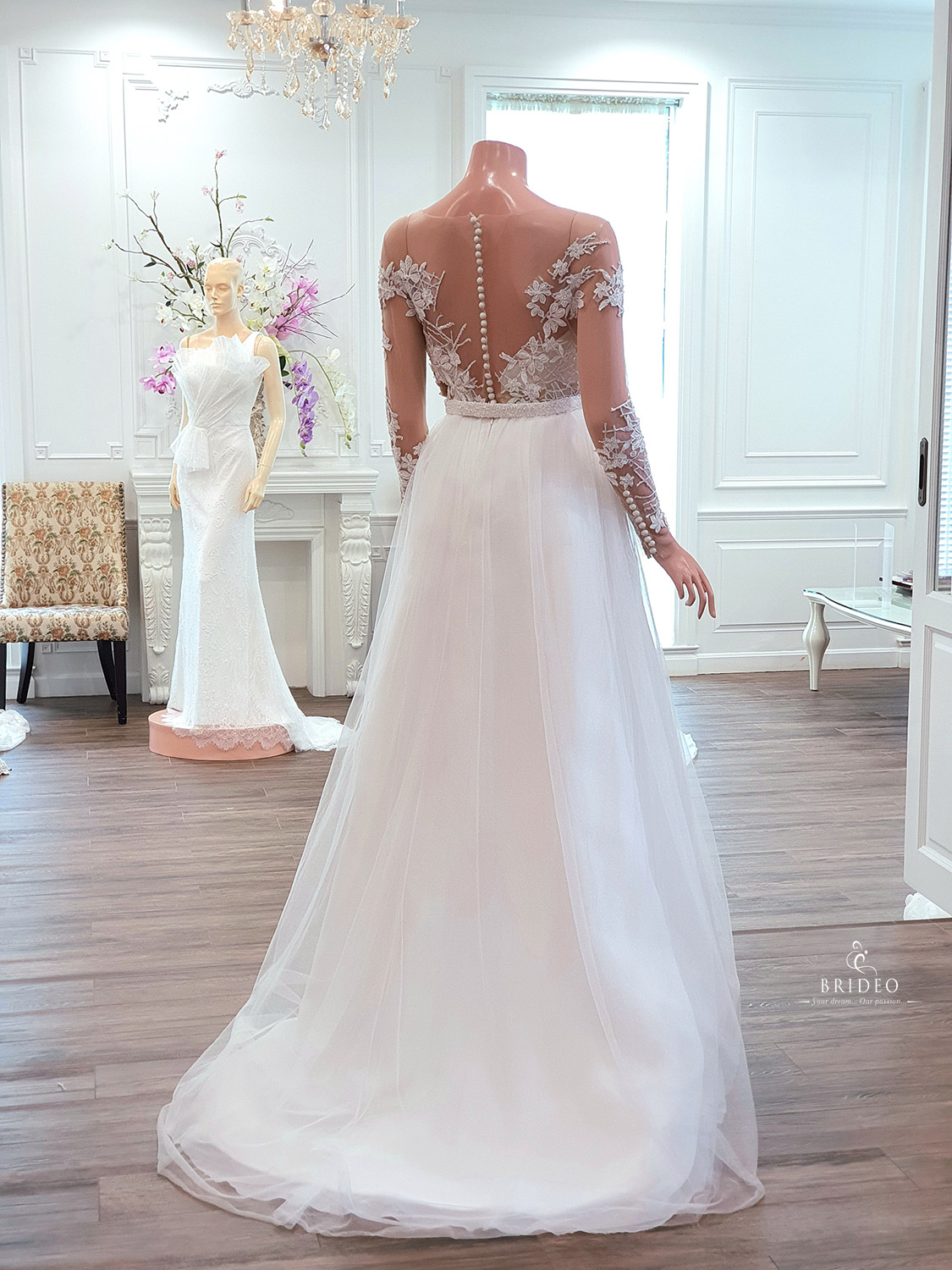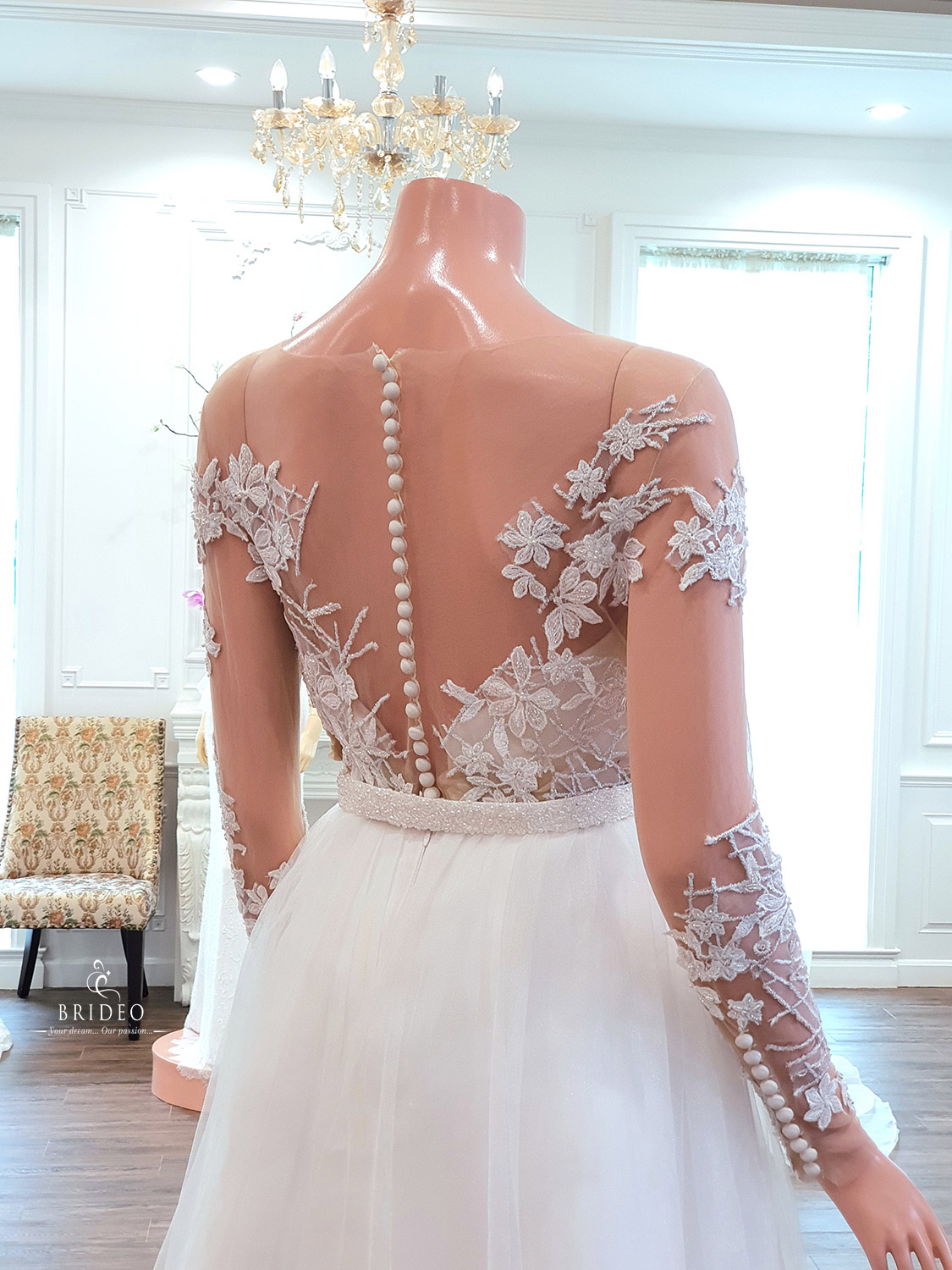 ชุดแต่งงาน minimal หวานละมุน ให้การพิถีพิถันในการวางลายลูกไม้ เพื่อกำจัดจุดบกพร่องของเจ้าสาวเจ้าเนื้อ มีส่วนเกินบริเวณต้นแขนและปีกหลัง เพิ่มความโปร่งบางแต่ปกปิดส่วนเกิน ชุดใช้ในงาน outdoor หรืองานหมั้นเช้าเลี้ยงเที่ยง เน้นงานความอบอุ่นทันสมัยเป็นกันเอง สวย ใสอ่อนเยาว์ แบบไม่ต้องพยายาม เมื่อสวมเวลให้ลุคเจ้าสาวในฝันสไตล์ฝรั่ง ชุด: I wanna love you forever
