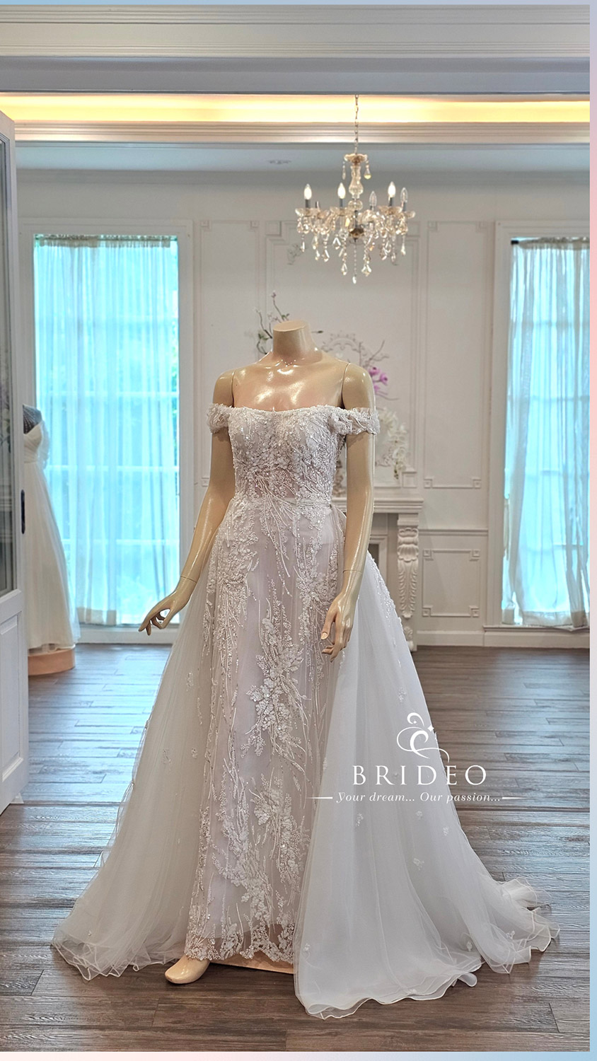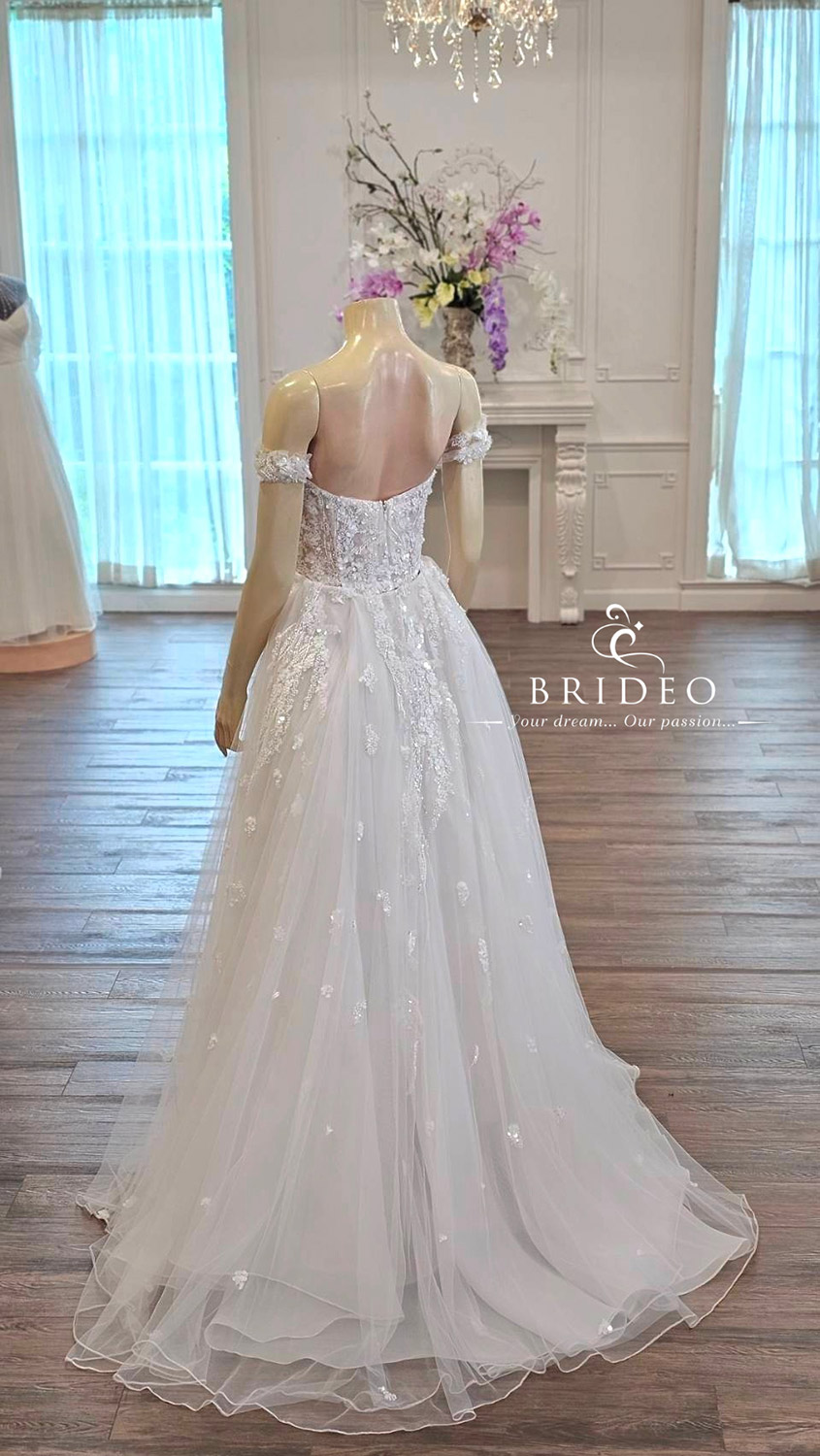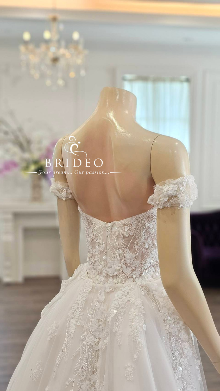 ชุดแต่งงานตบแต่งปราณีตด้วยลูกไม้คุณภาพสูง เลื่อมระยับจับตา สำหรับบริการเช่า พร้อมปรับ size เข้ารูป อวดอกสวย เอวคอดโดยช่างแก้มืออาชีพ