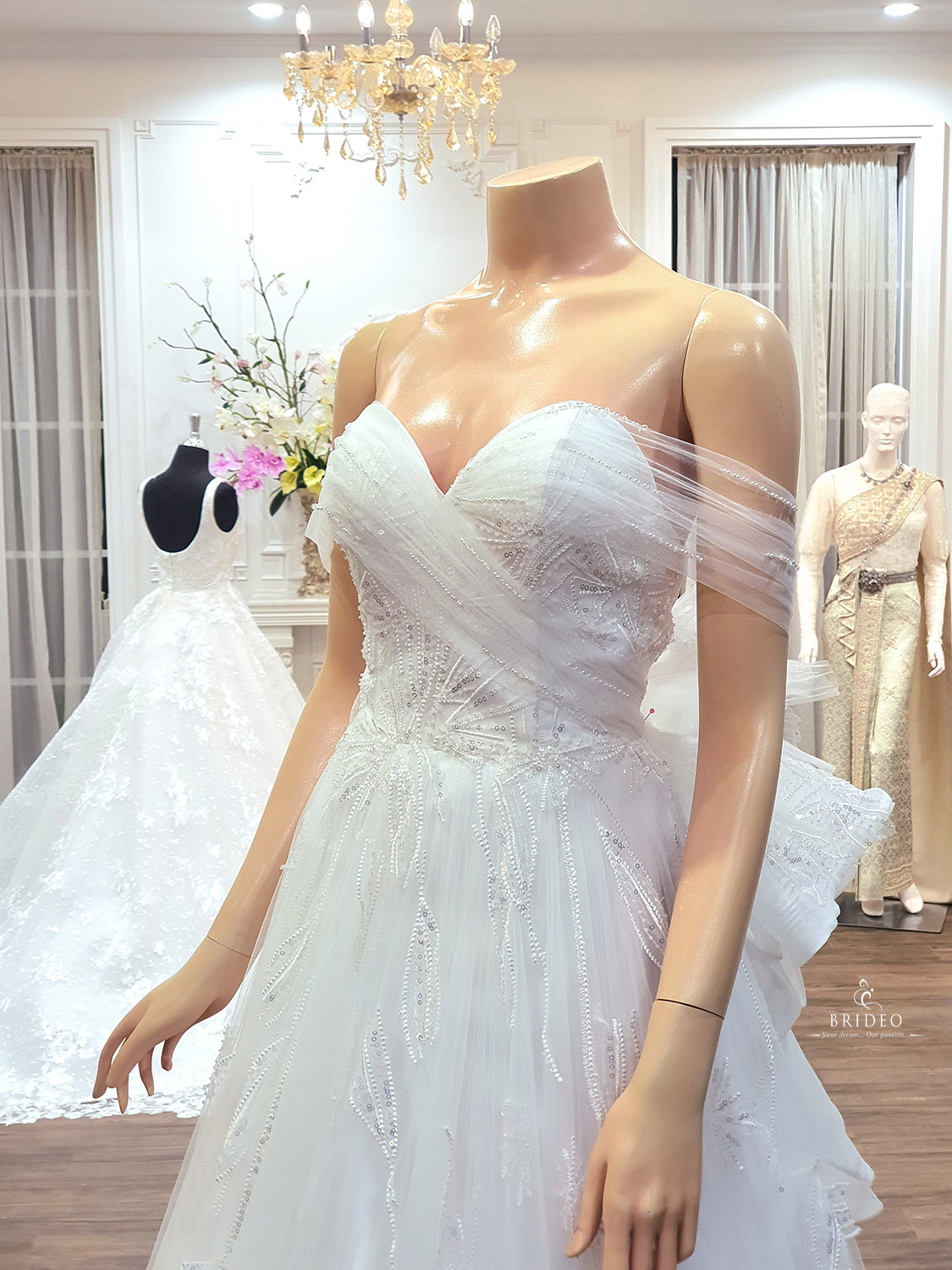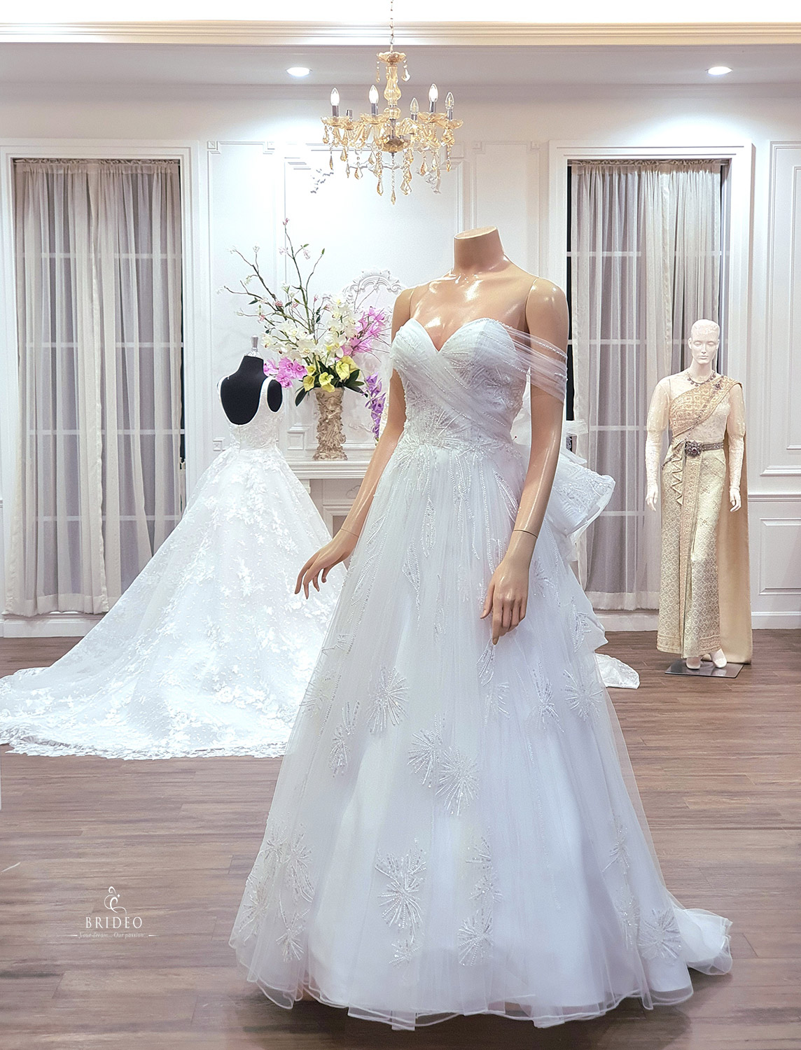 ชุดแต่งงาน รูปอกทรง sweet heart ให้ความโปร่งบาง ตบแต่งด้วยลูกไม้สวย ระยิบ ประดับไหล่ด้วยเทคนิคการจับเดรปหวานละมุน (มี collection plus size)