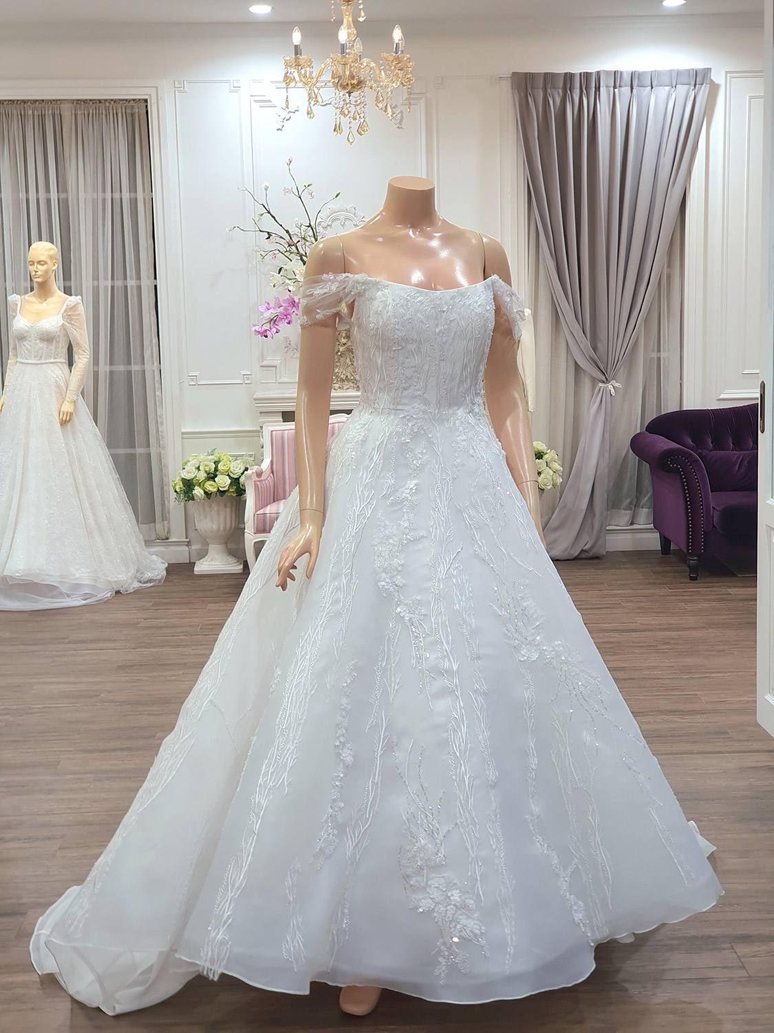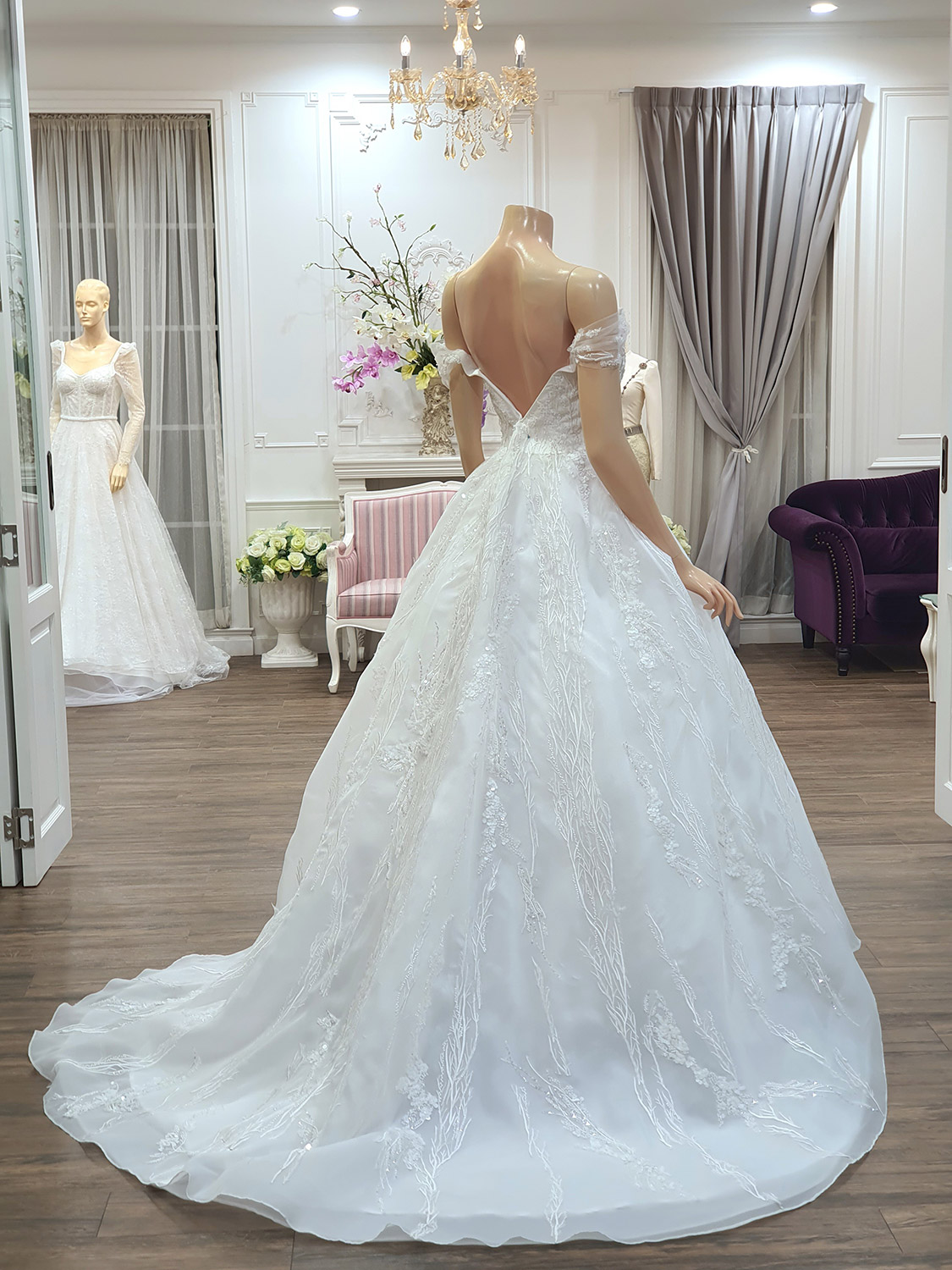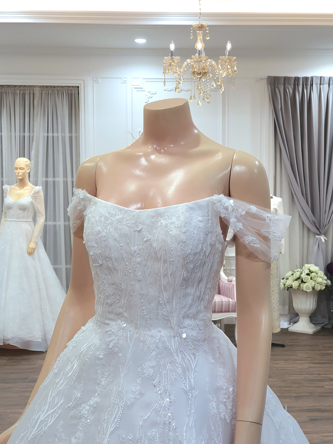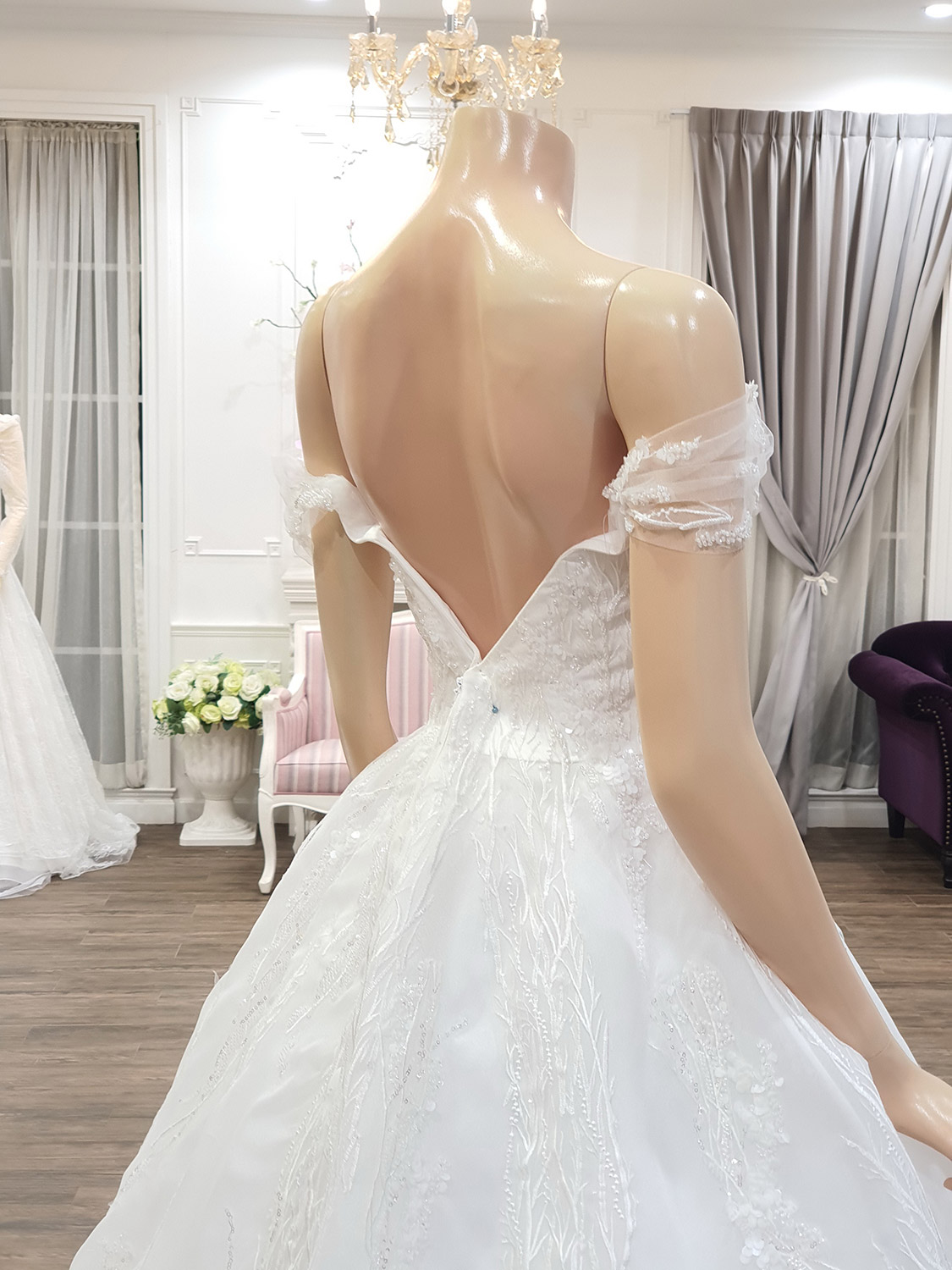 ชุดแต่งงานออกแบบตบแต่งปราณีต สำหรับบริการเช่าพร้อมปรับ size โดยช่างแก้มืออาชีพ เจ้าสาวจะได้รูปอกสวย เอวคอด บอบบาง