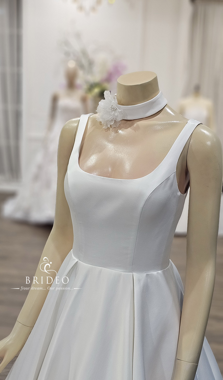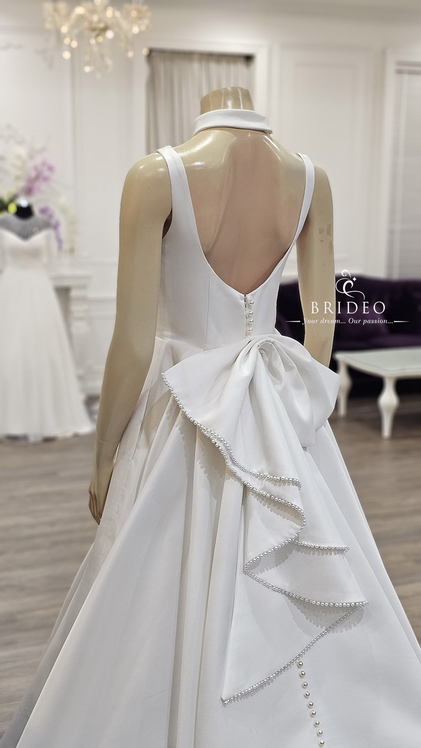 สำหรับว่าที่เจ้าสาวมองหาลุคหวานน่ารักที่ไม่ต้องการใส่ชุดแต่งงานเกาะอก ชุดออกแบบเว้าหลังพร้อมเส้น curve หวาน ๆ อวดหลังโปร่งสวย พร้อมประดับดีเทลเล็ก ๆ ทั้งดอกไม้ประดับ hand made, โบว์หลังใหญ่ปักมุกละเอียดโดยรอบ และกระดุมถักเรียงร้อยเป็นระเบียบนับร้อยเม็ดจรดถึงชายกระโปร่งซ่อนความหรูหรา  style quiet luxury