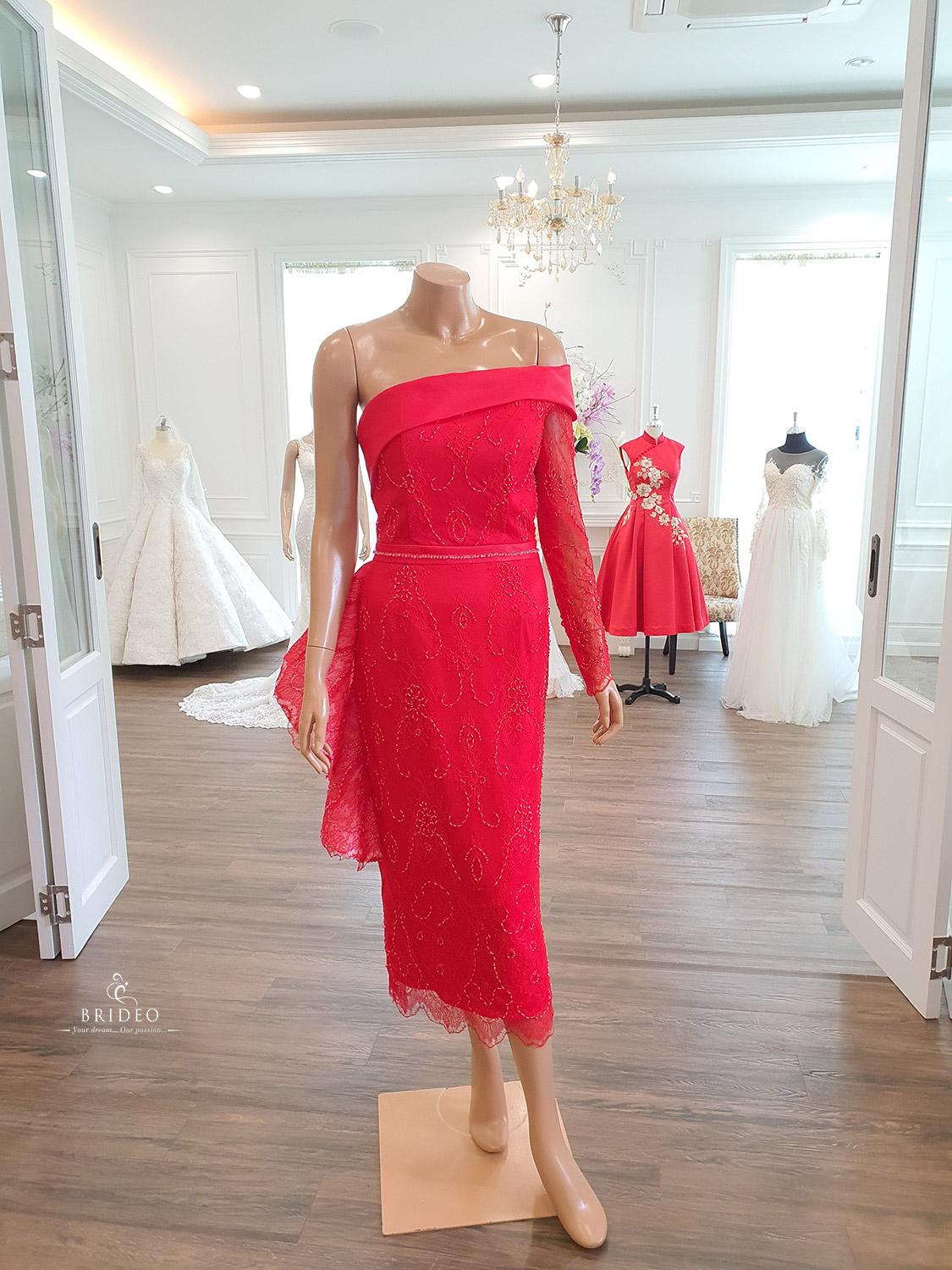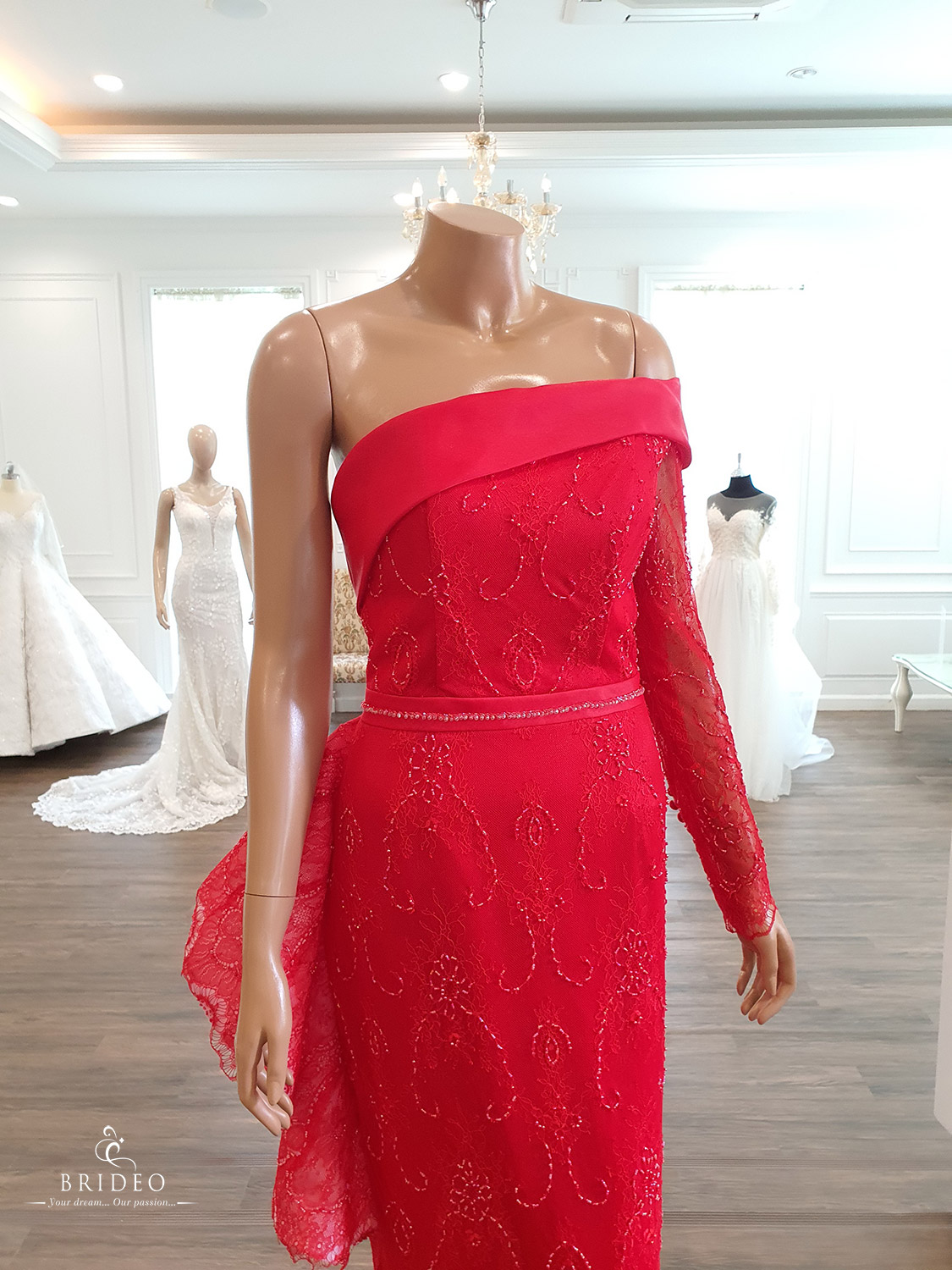 ชุดหมั้นยกน้ำชาแดงคัทติ้งสวย ลุค modern เจ้าสาวสวยมั่น ทันสมัย ประดับด้วยลุกไม้ฝรั่งเศส ปักคริสตอลเลื่อมละเอียด