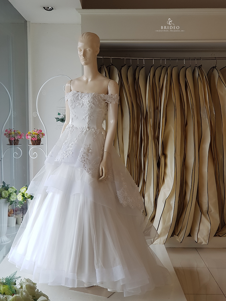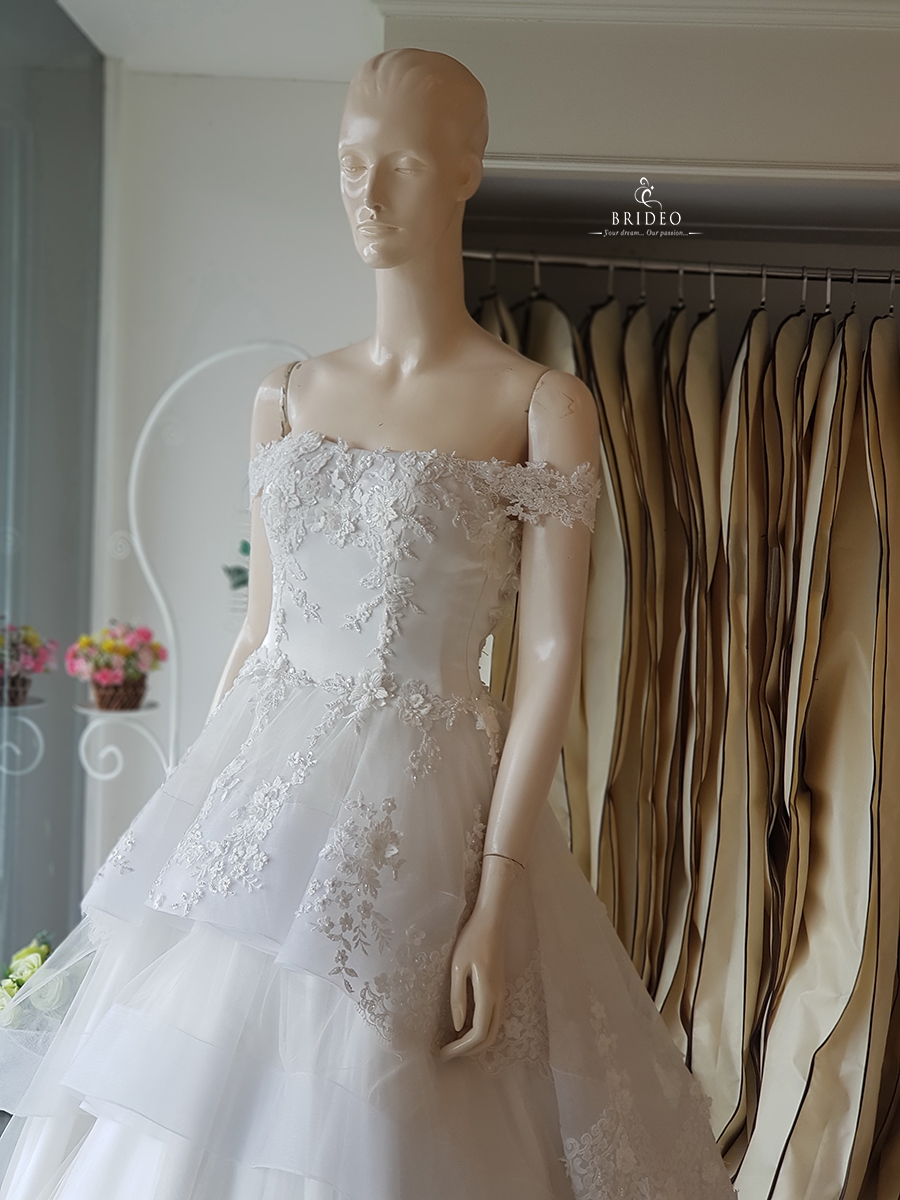 ชุดแต่งงาน ทรง ball gown เกาะอก ประดับลูกไม้ ดอกลอยสวย ได้ลุคใส ใส เจ้าหญิง