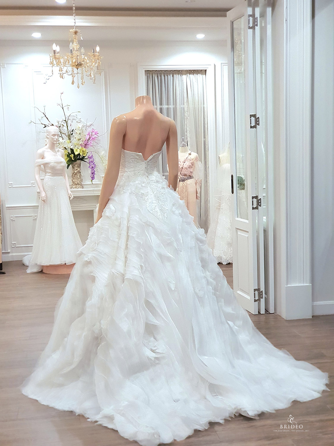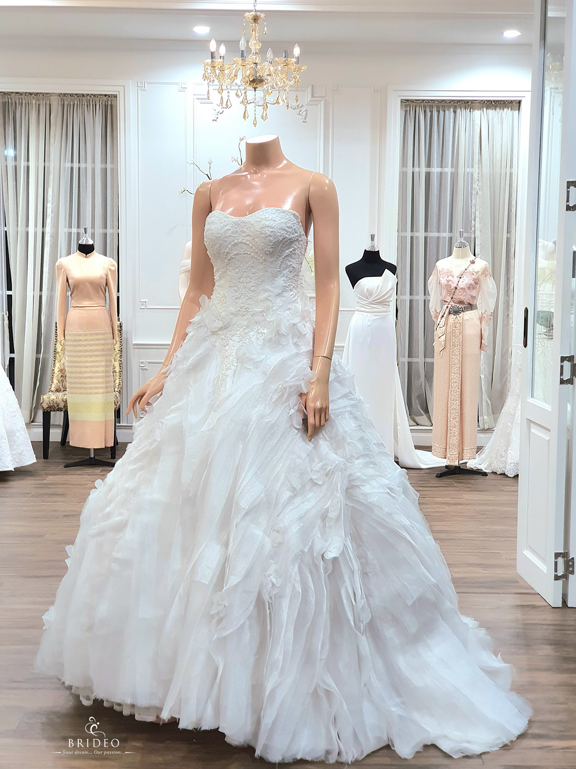 ชุดแต่งงาน ทรง ball gown ได้ลุคหวานจากดอกไม้ประดับประดิษฐ์ด้วยผ้าออร์แกนดี้ตัดขอบลนเทียน ชุดพร้อมปรับ size อวดอกสวย เอวคอด (หากเจ้าสวยช่วงตัวล่ำสั้น ชุดนี้ช่วยแก้ไขข้อบกพร่องได้) ชุด: aurora