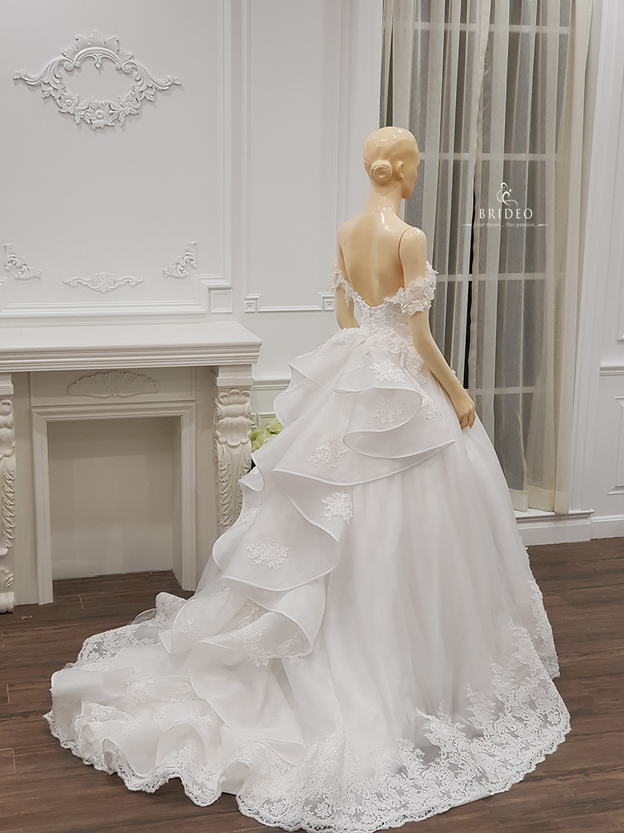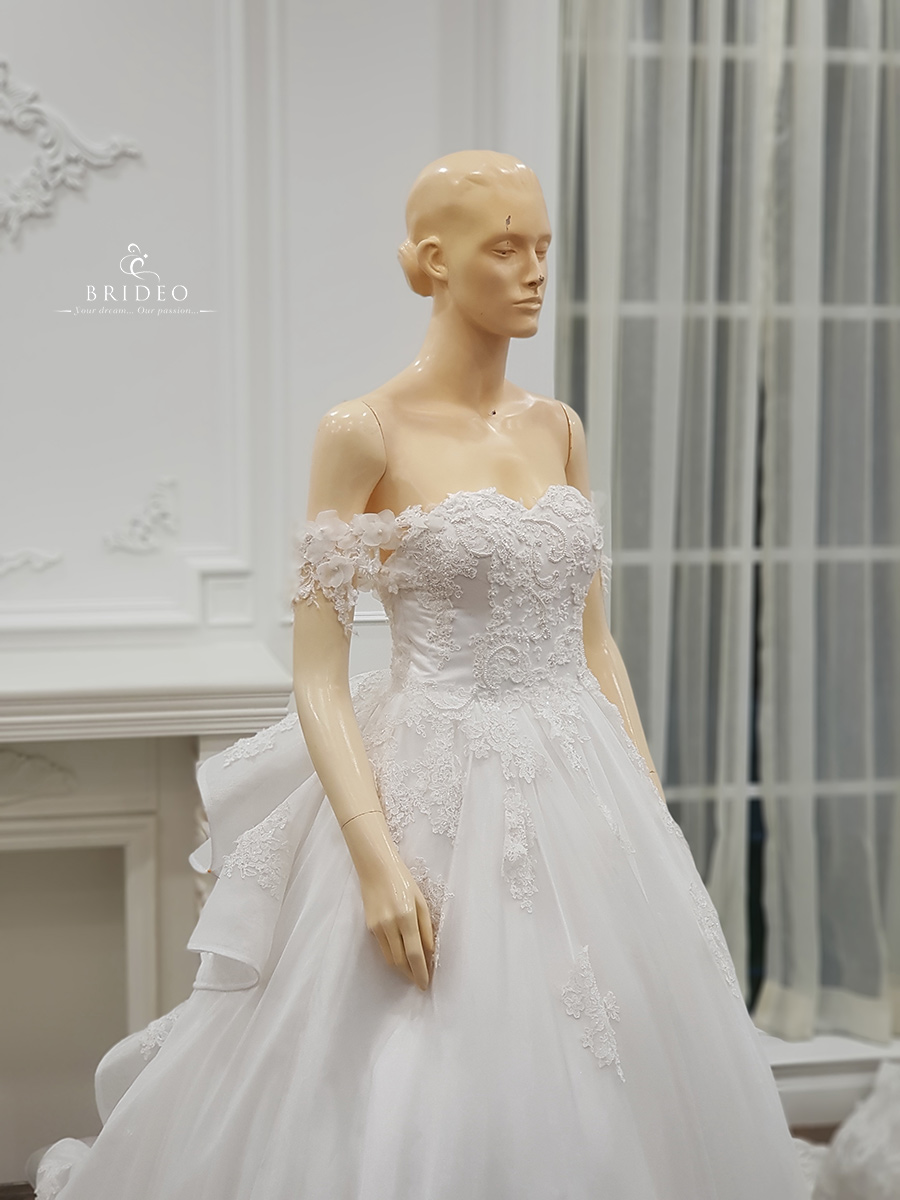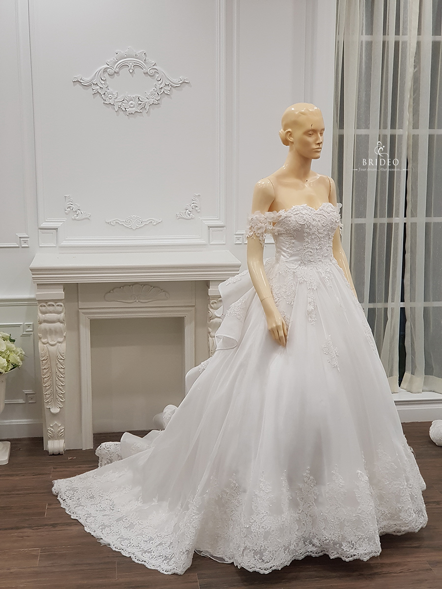 ชุดแต่งงาน ทรง ball gown เปิดไหล่ ลุคเจ้าหญิงน่ารัก ใส ใส (สามารถแก้ไขข้อบกพร่องเจ้าสาวอวบ หุ่นไม่สมส่วน และเพิ่มลุคอ่อนเยาว์ ) ชุดเช่าพร้อมบริการปรับ size ปราณีตและเครื่องประดับ