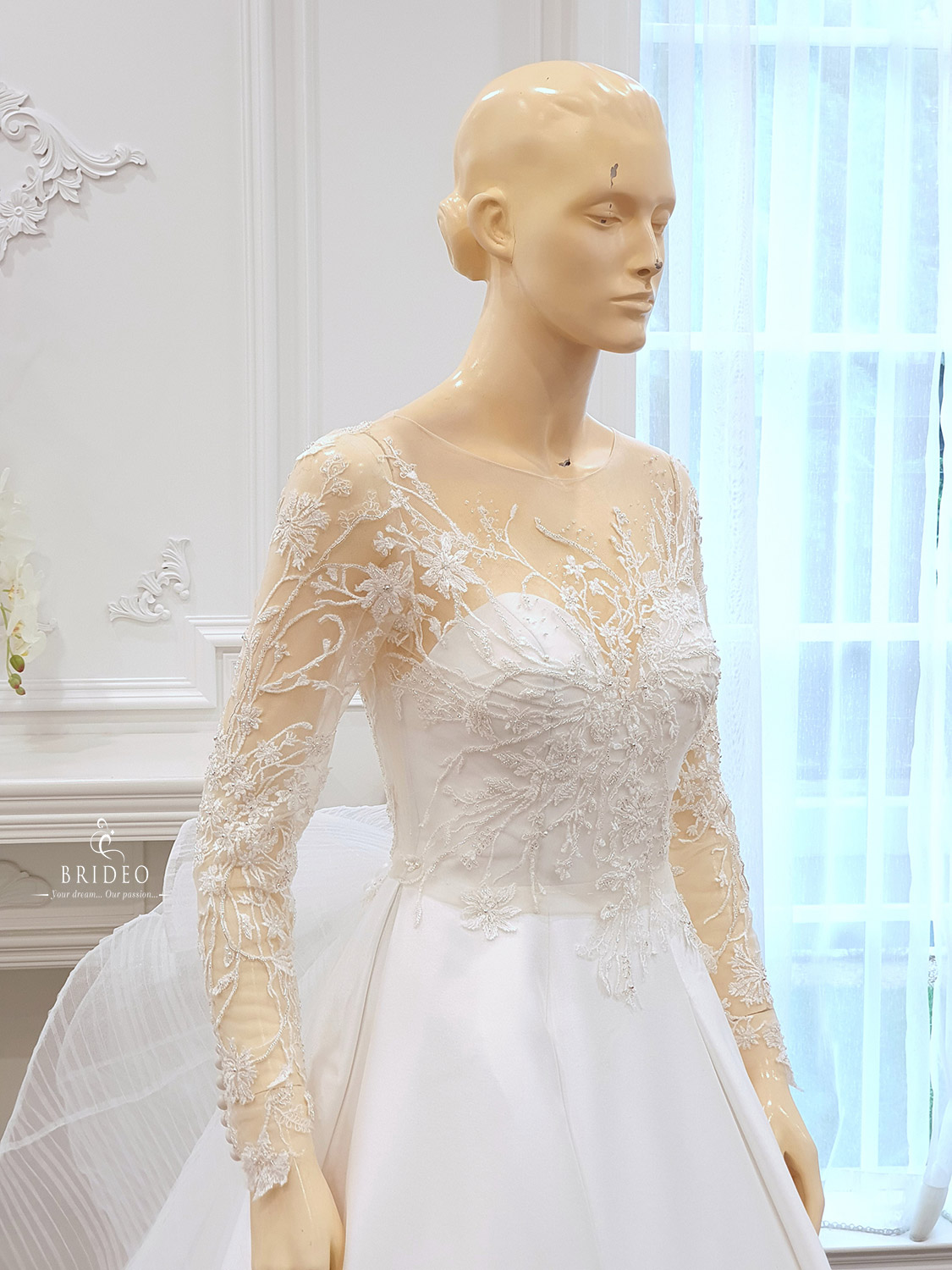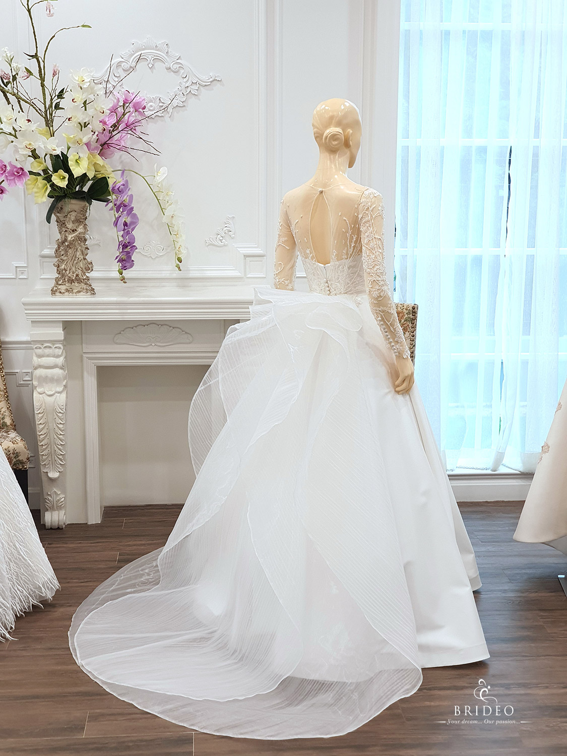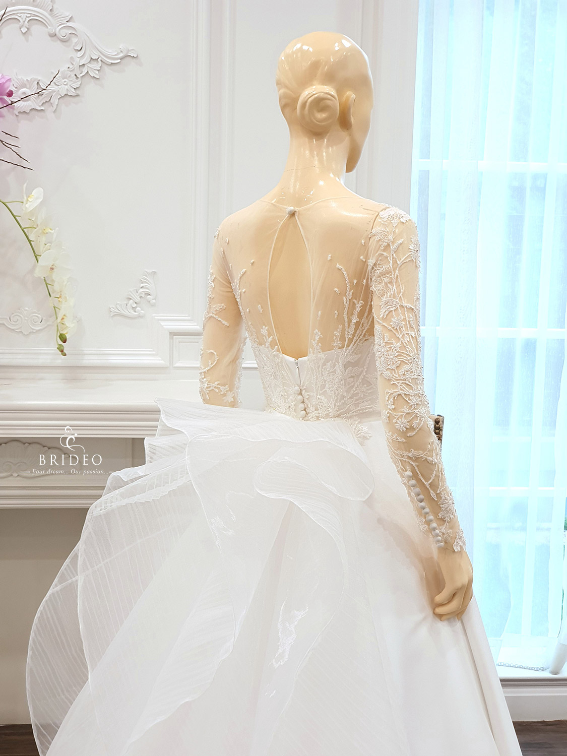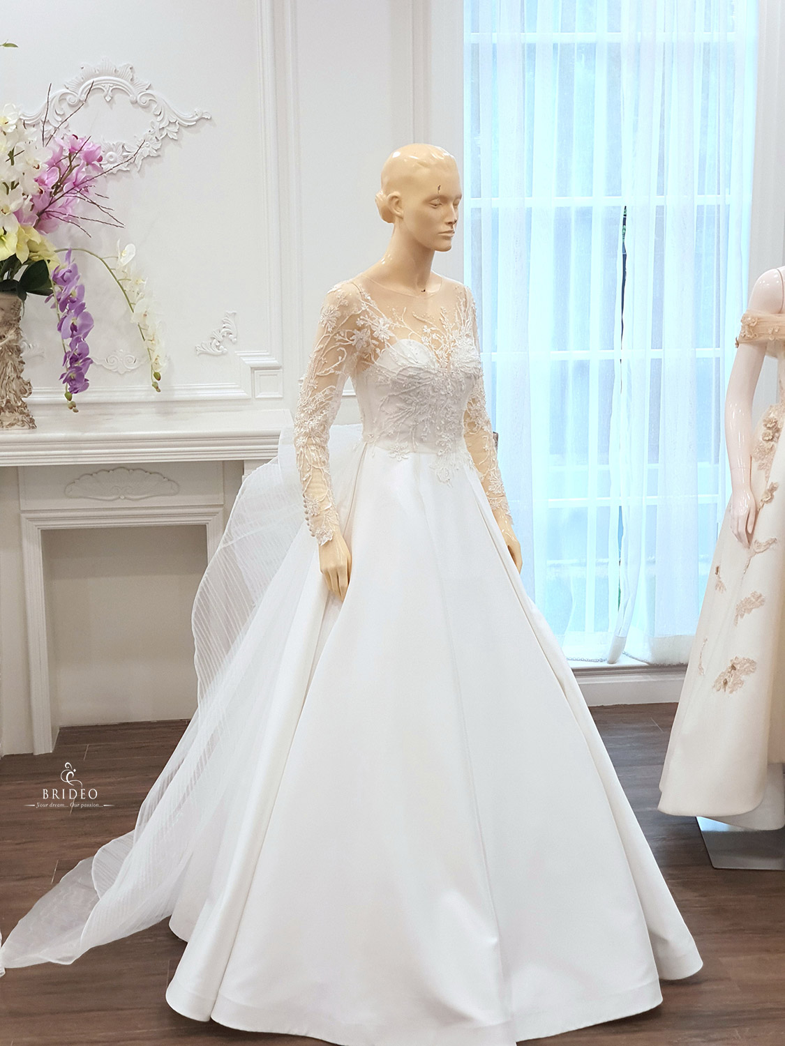 ชุดแต่งงานหรูทรง ball gown หรู (กรณีจัดงานขนาดกระทัดรัดต้องการเดินคล่องตัว สามารถถอดหางชุดได้) พร้อมบริการปรับ size ปราณีตและเครื่องประดับ