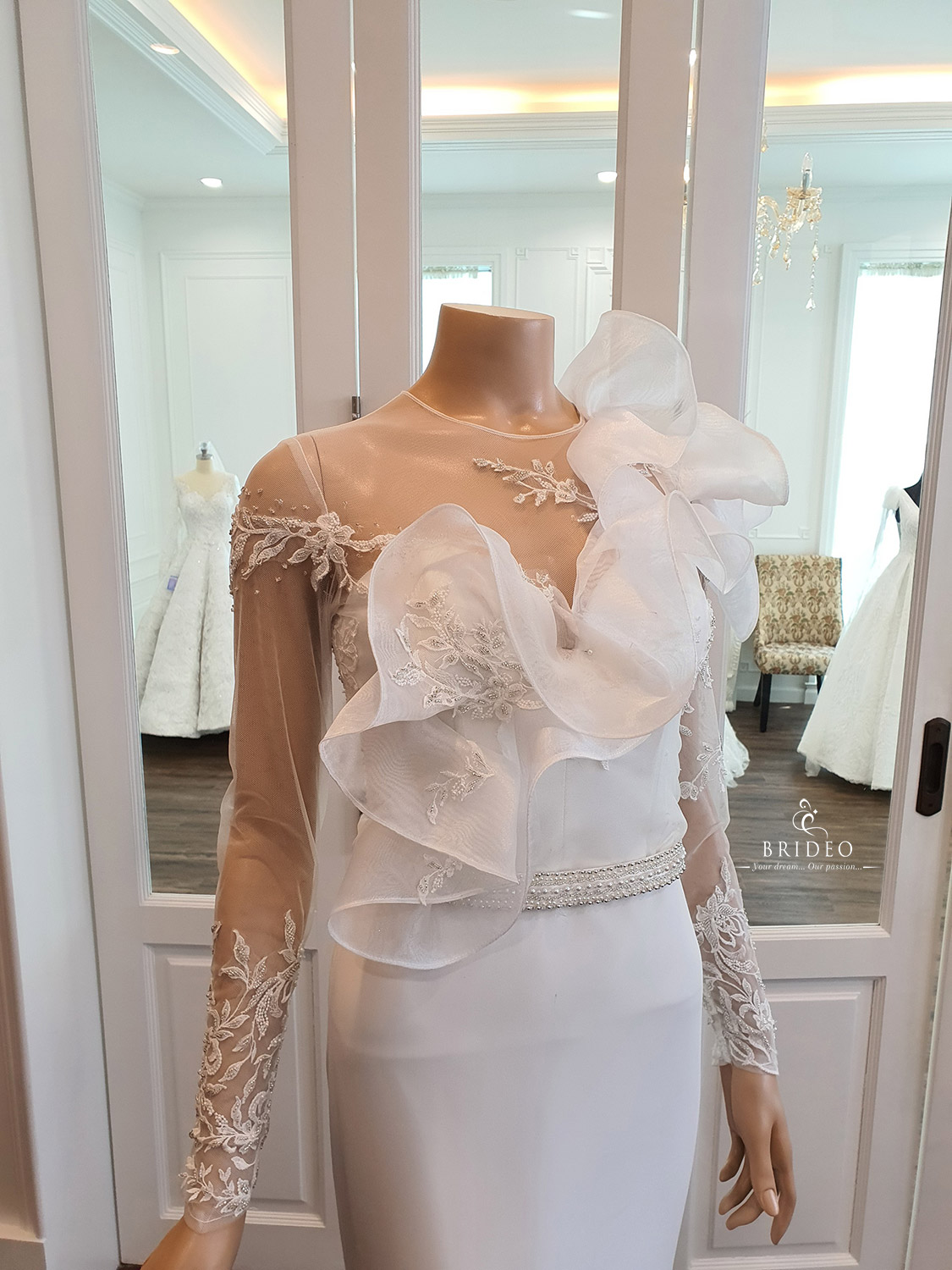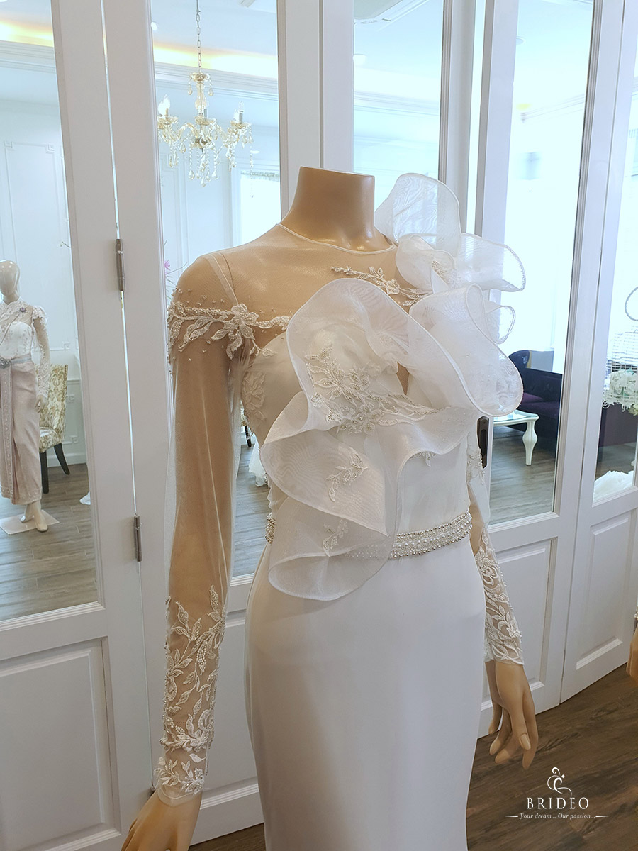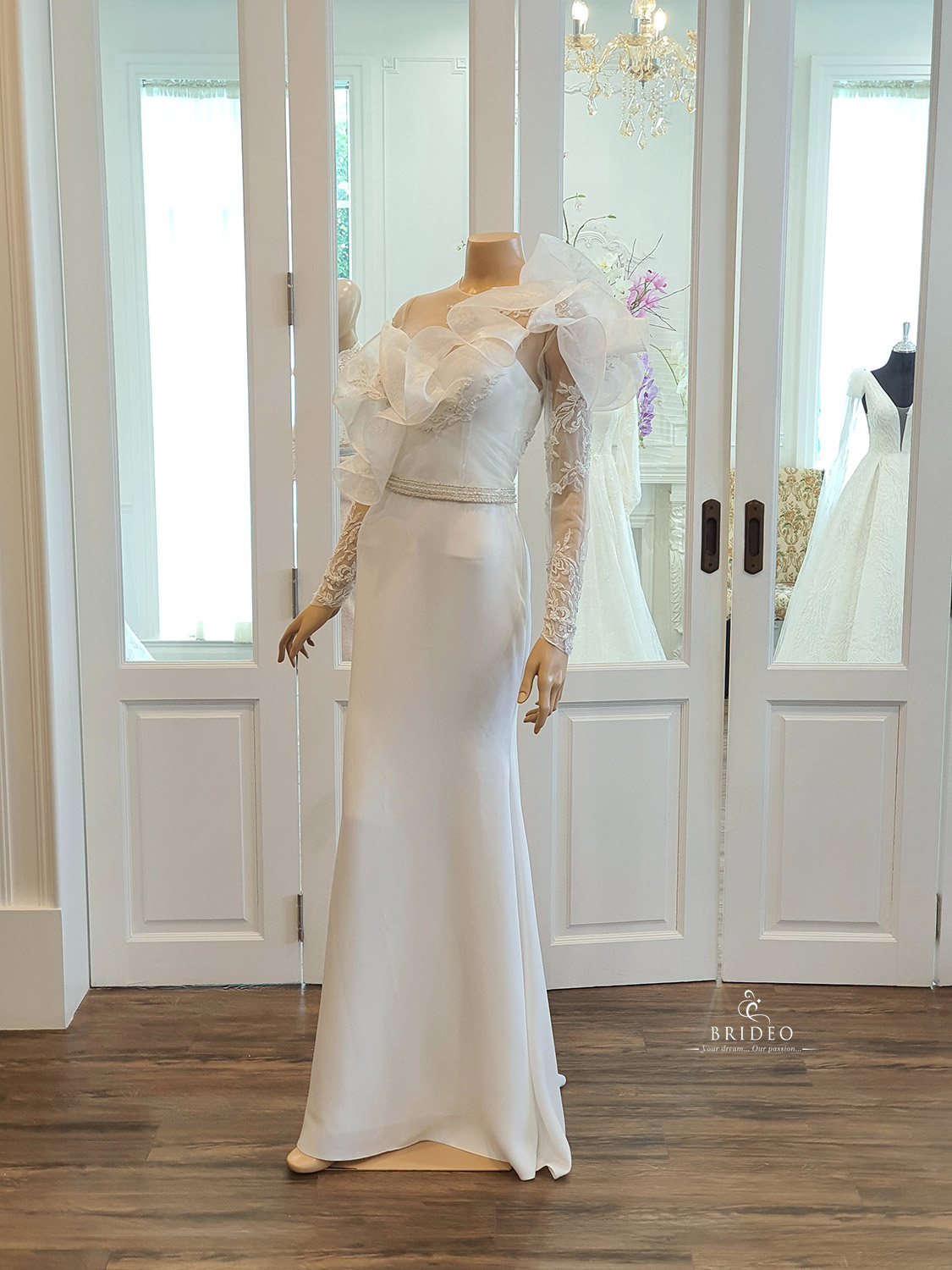 ชุดแต่งงานทรงหางปลา เหมาะสำหรับงานเช้าเลี้ยงเที่ยง งาน outdoor ในสวน พร้อมบริการปรับ size ปราณีตและเครื่งอประดับ