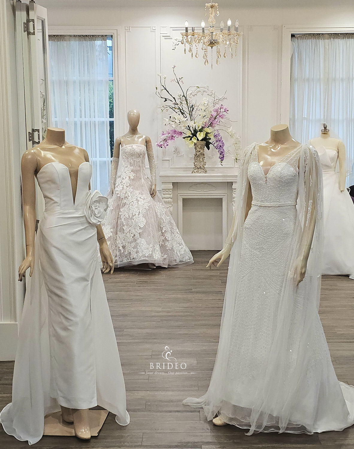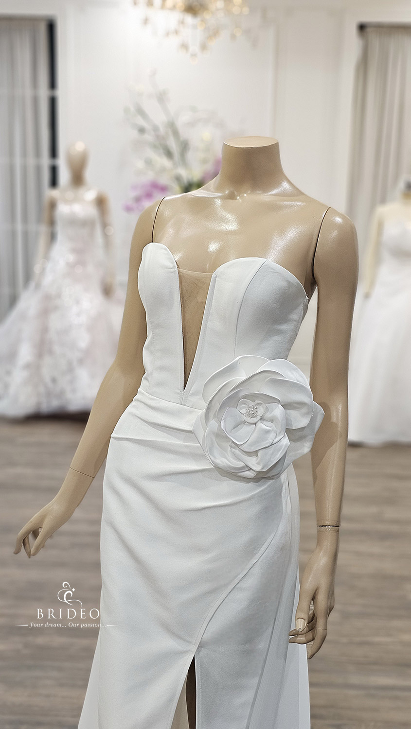 ชุดแต่งงานคัทติ้งหรู รูปอกงดงาม ประดับ detail ดอกไม้ เหมาะสำหรับเจ้าสาวมีสไตล์ ธีมงาน minimal อบอุ่นเป็นกันเอง