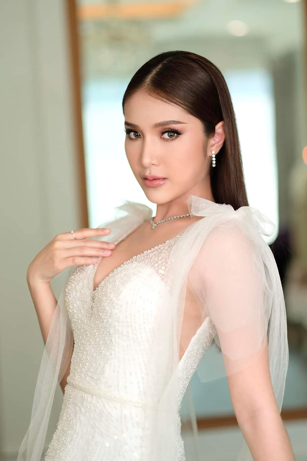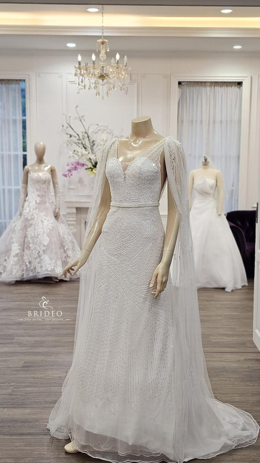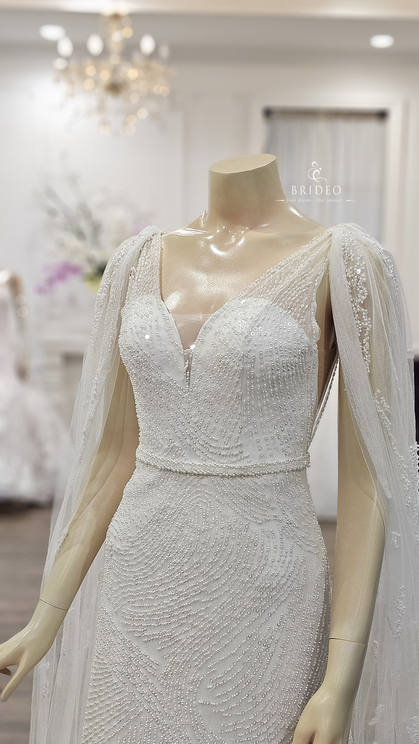 ชุดแต่งงานคัทติ้งสวย ปักเลื่อมคริสตอลระยับหรู แวววาวระยับจับตาด้วยงานเขียนลายปัก สวยไม่ซ้ำใคร  (ใส่ได้สองแบบ โบว์ระย้าพริ้วสามารถถอดได้)