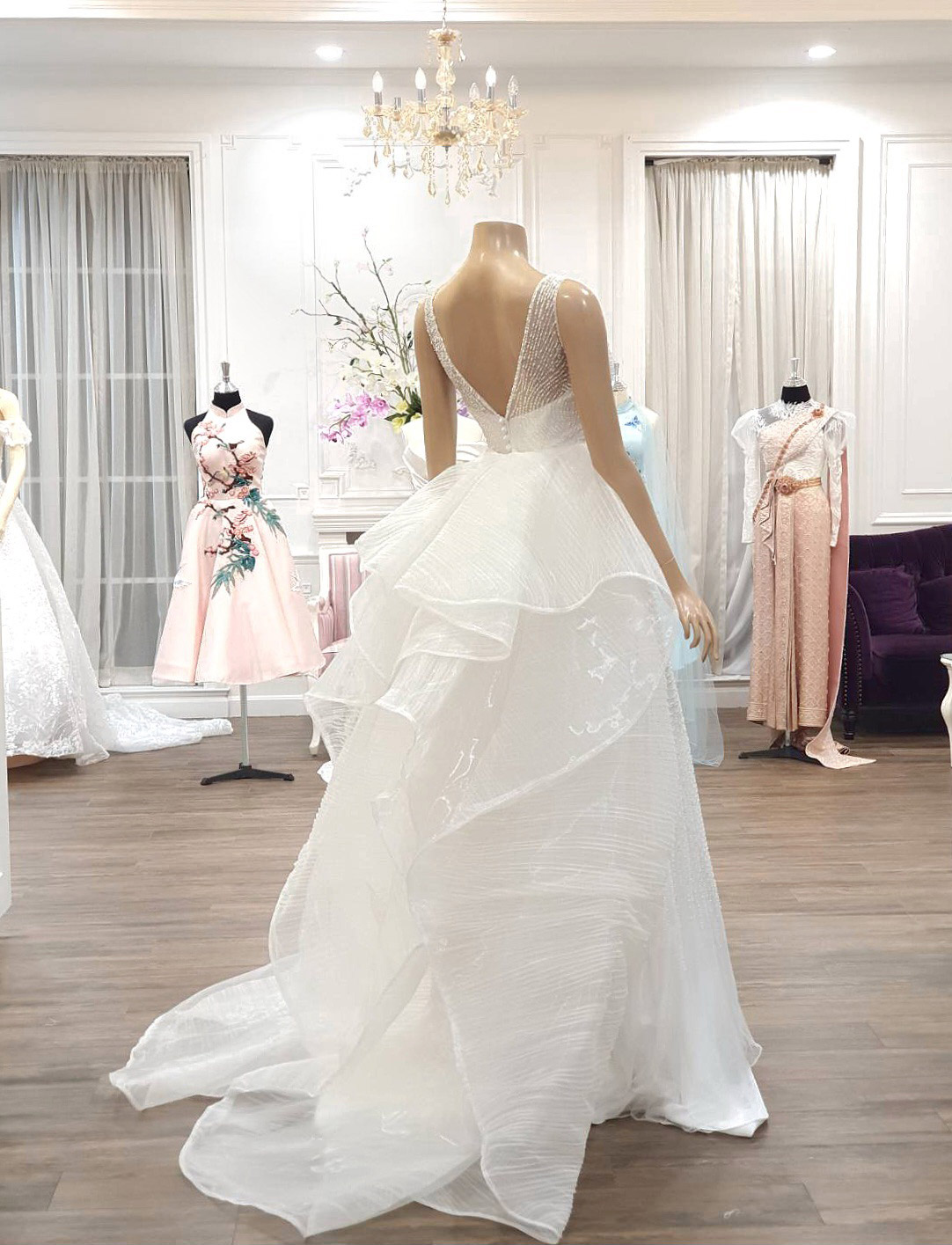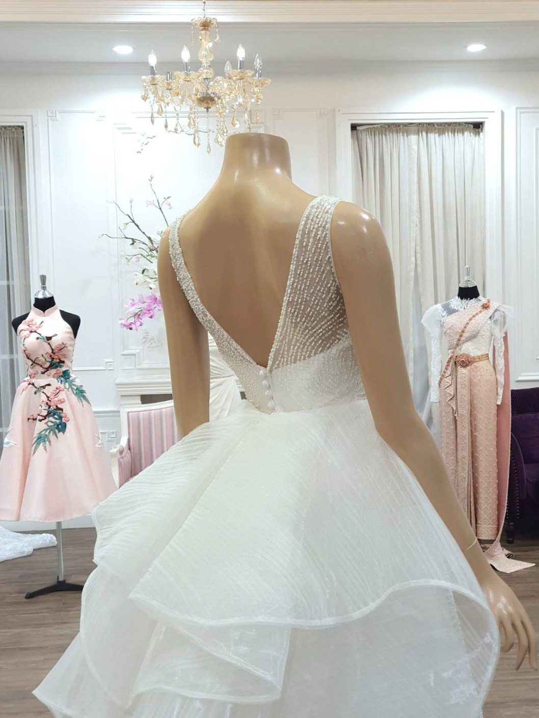 ชุดแต่งงานตัดปราณีตสำหรับบริการเช่าพร้อมบริการปรับ size โดยช่างแก้มืออาชีพประสบการณ์สูง ได้รูปอกสวย อวดเอวคอด ความยาวเดินได้จริง