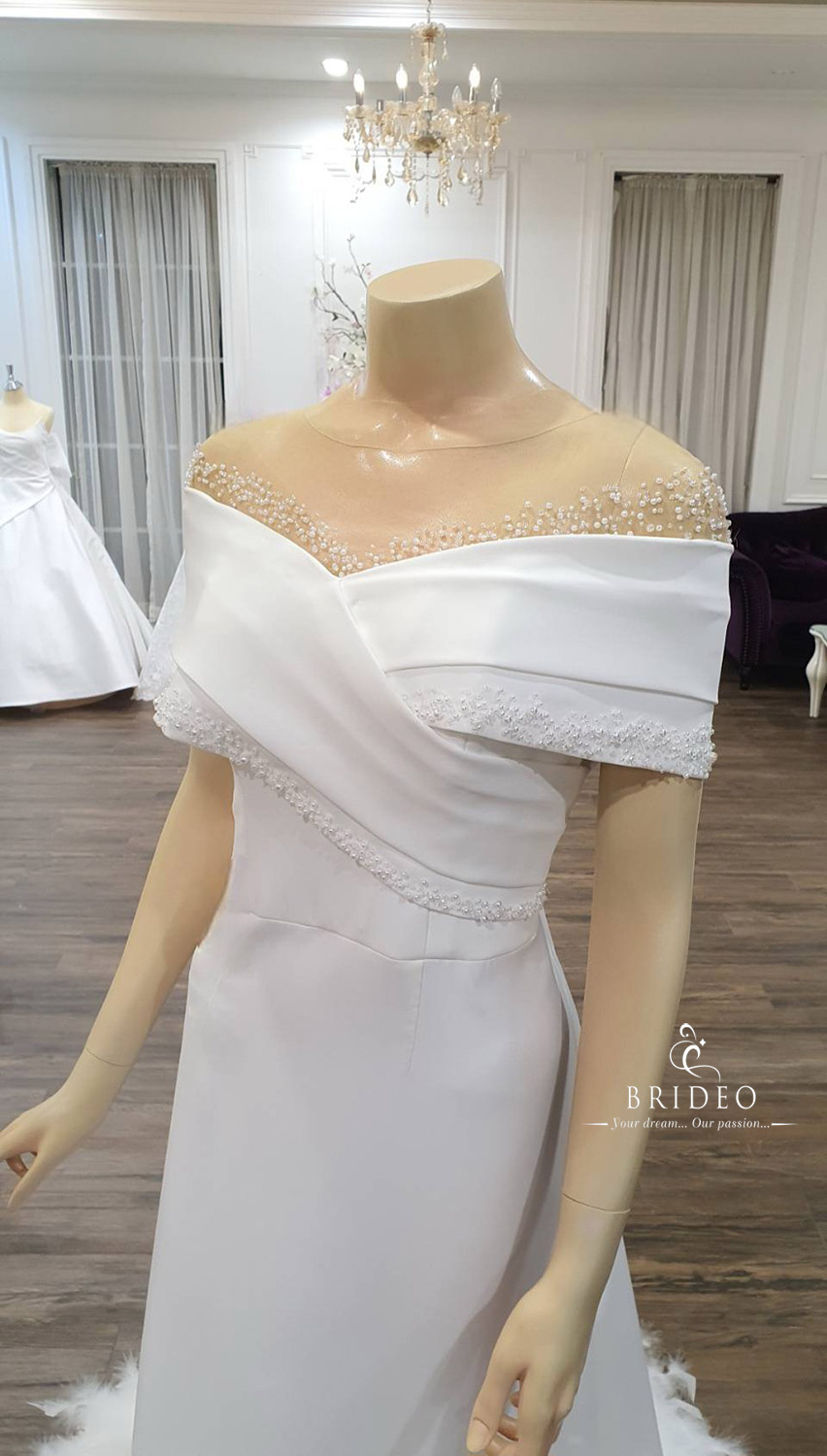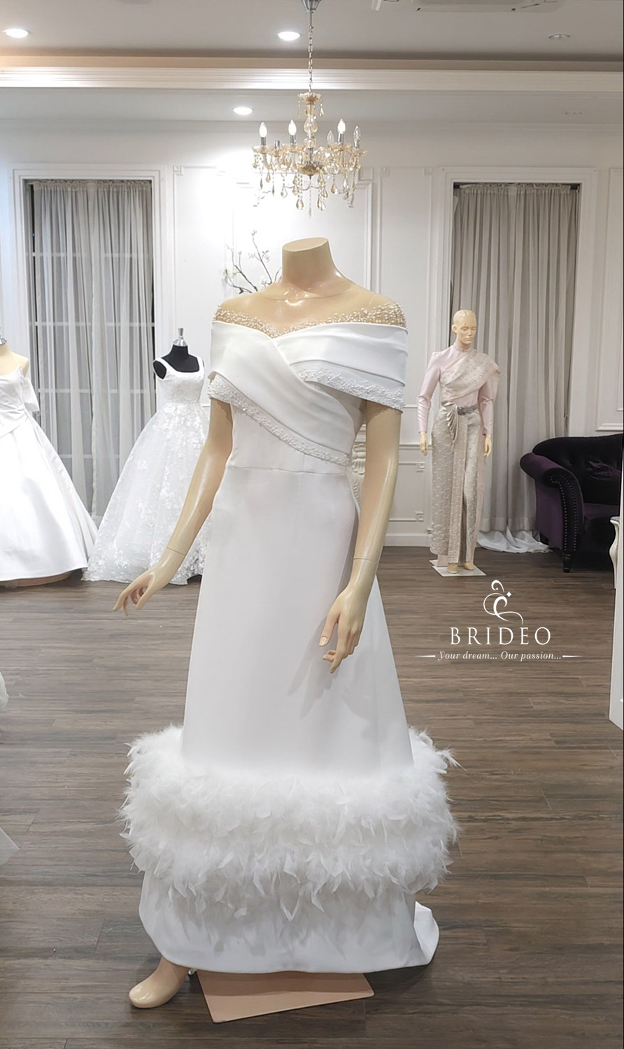 ชุดแต่งงานทรงเอตบแต่งด้วยซีทรูเนื้อผ้าสวย ปักประดับคริสตอลหรูละเอียดบริเวณไหล่ เพิ่มเส้นสายงาม ๆ ด้วยการจับเดรปปราณีต  พร้อมธีม vintage เล็ก ๆ จากขนนกประดับบนกระโปรงเนื้อผ้าแสนสวย แนะนำสำหรับเจ้าสาวเจ้าเนื้อปกปิดช่วงต้นแขน และต้องการการเคลื่อนไหว ทักทายแขกในงานเลี้ยงแบบคล่องตัว  ชุดตัดเป็น size L, XL