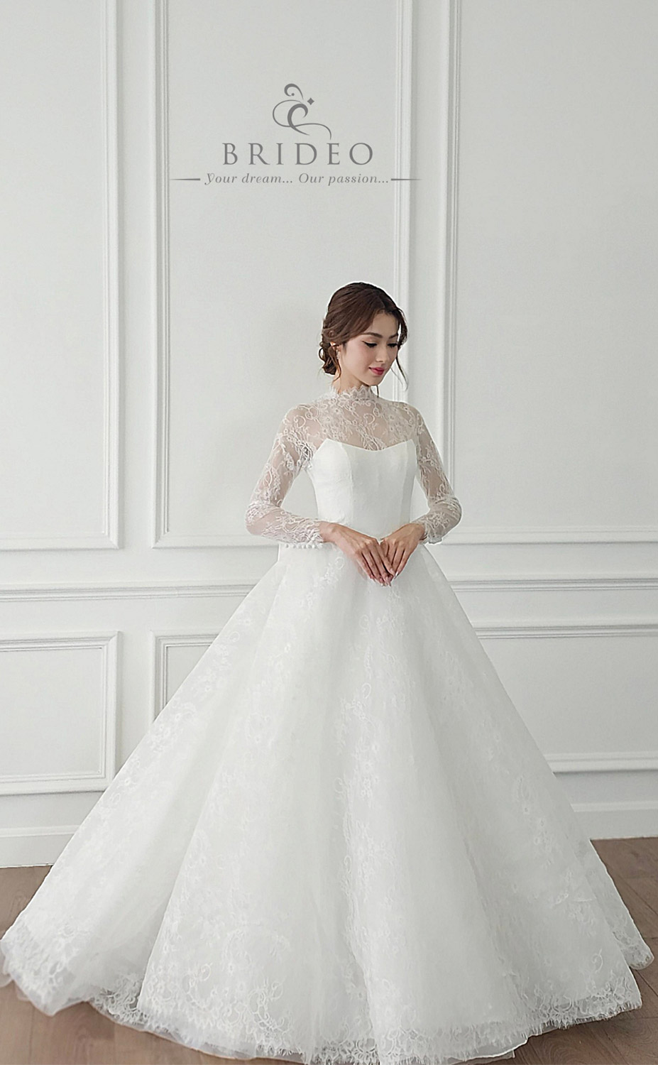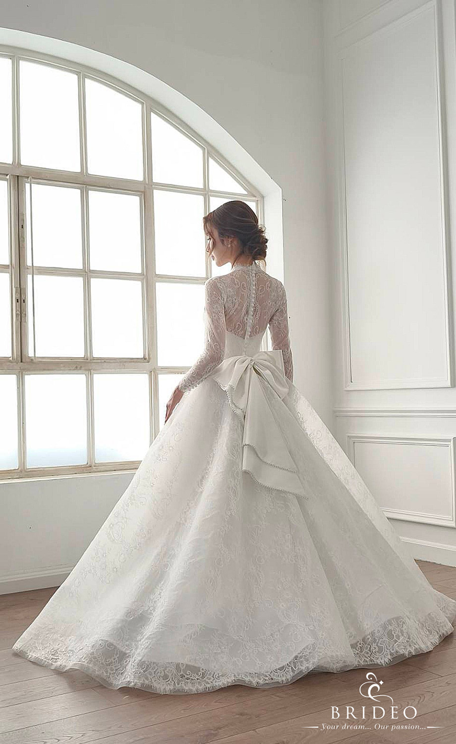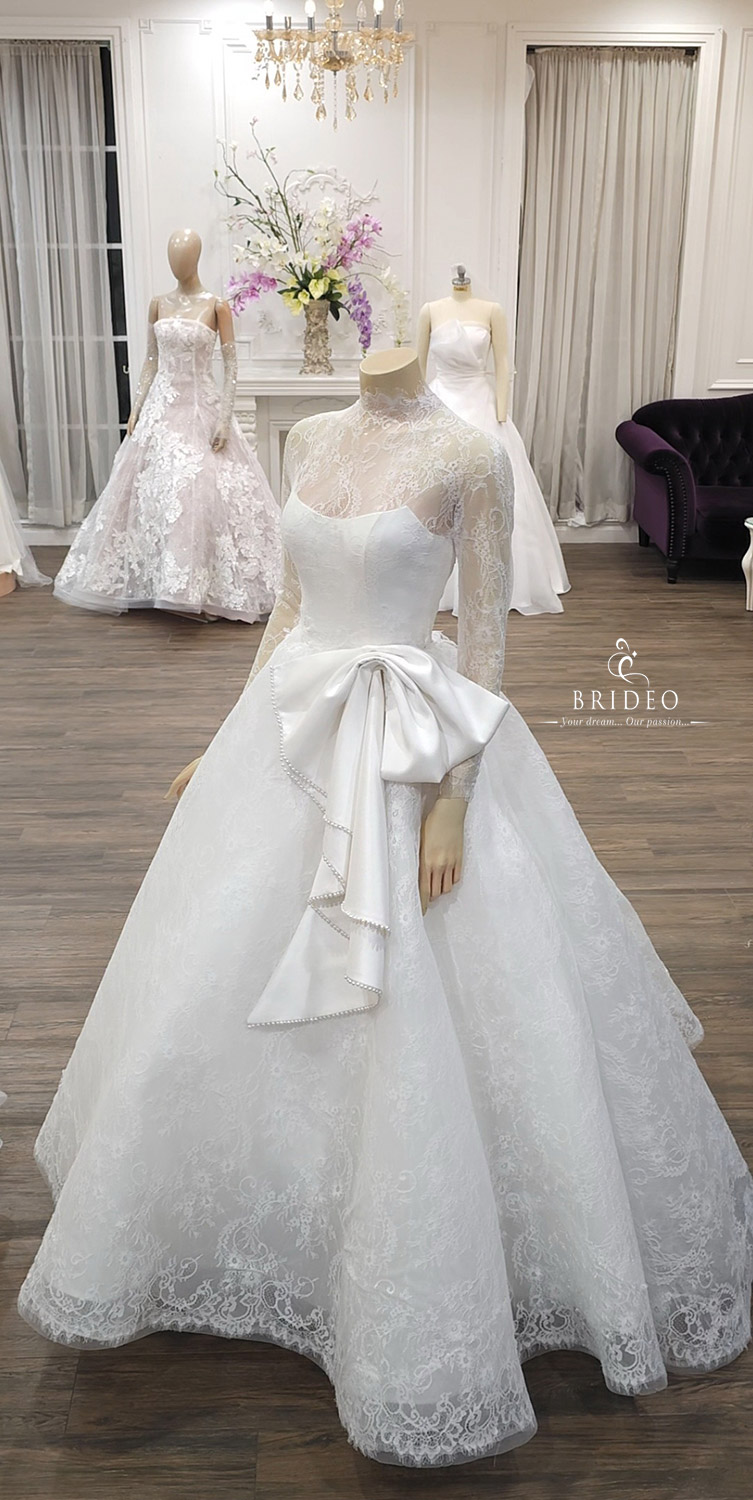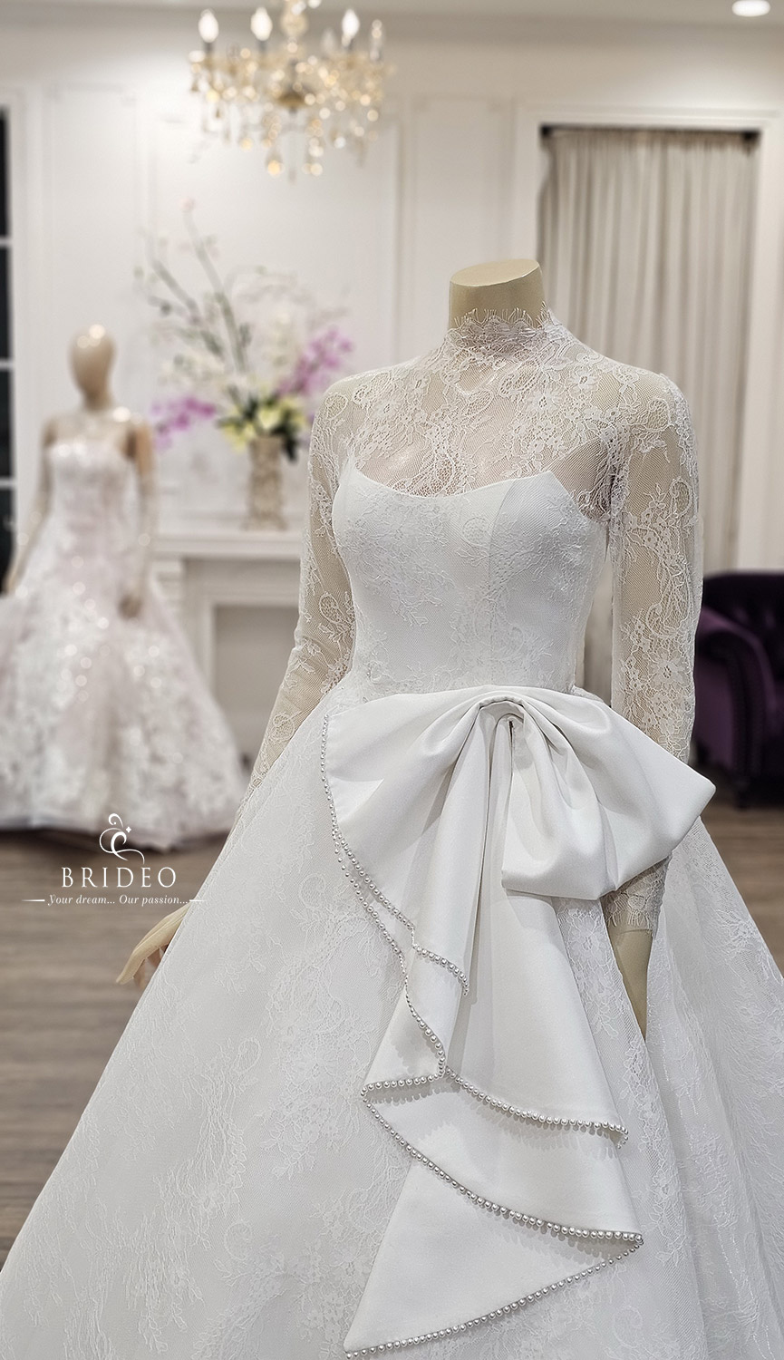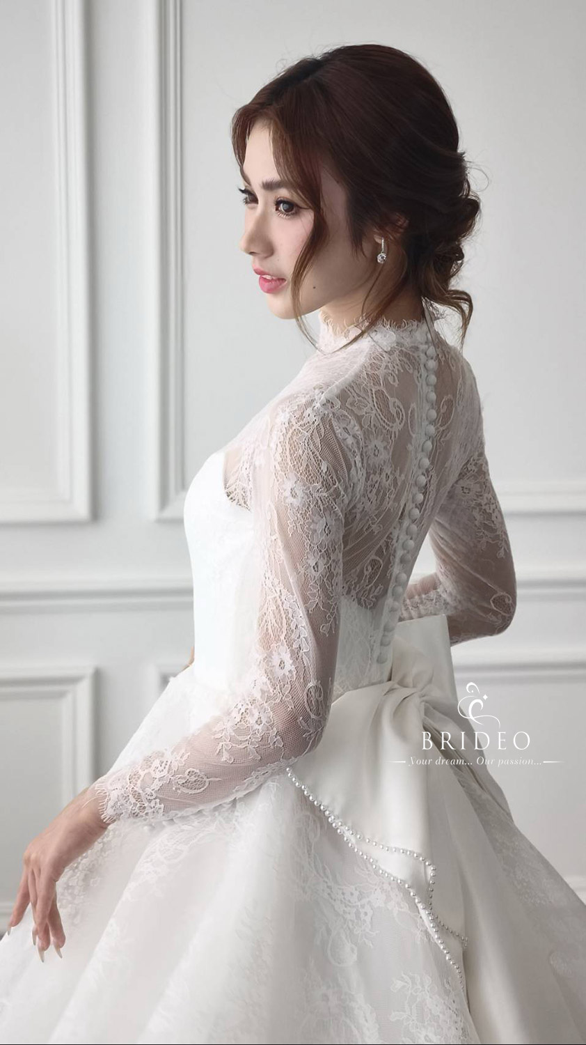 ชุดแต่งงานสำหรับพิธีเข้าโบสถ์ เรียบหรูด้วยลูกไม้ฝรั่งเศส วางตบแต่งในจังหวะสวย เชิงลูกไม้แสนละมุน ชุดแต่งงานออกแบบตัดเย็บให้เดินสวย เบามีทรง งดงามทุกจังหวะเยื้องย่าง ราวกับลอยอยู่ในความฝัน เหมาะสำหรับเดินไปกล่าวคำสาบานในพิธีสำคัญจดจำไปตราบนานแสนนาน