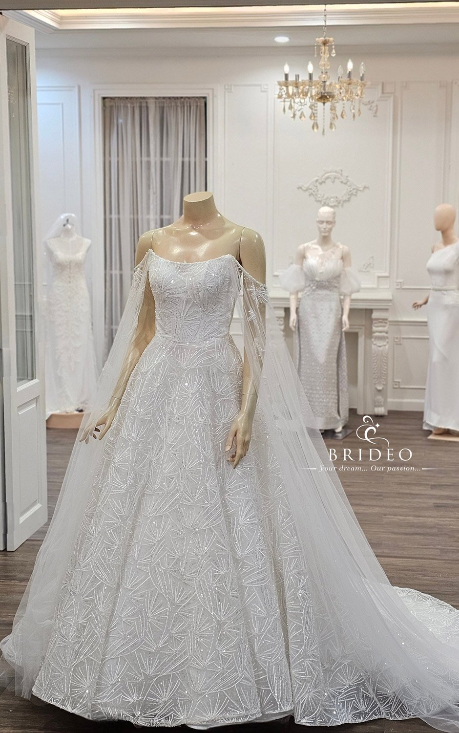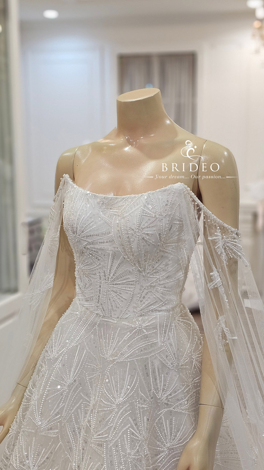 ชุดแต่งงานสไตล์เกาะอกเส้นสายเฉี่ยว ส่องประกายวิบวับสวยจับตาด้วยลูกไม้ปักลวดลายกราฟฟิกสุดหรู สำหรับว่าที่เจ้าสาวลุคมั่น ๆ ทันสมัย ที่ไม่หวานจนเกินไป ชุดแพทเทริ์นสวยให้เอวคอด รูปอกงดงาม ช่วยเสริมรูปร่างเจ้าสาว ชุดน้ำหนักเบา ทรงสุ่มสวย เดินได้เองอย่างสง่างาม ไม่ต้องอาศัยคนช่วย