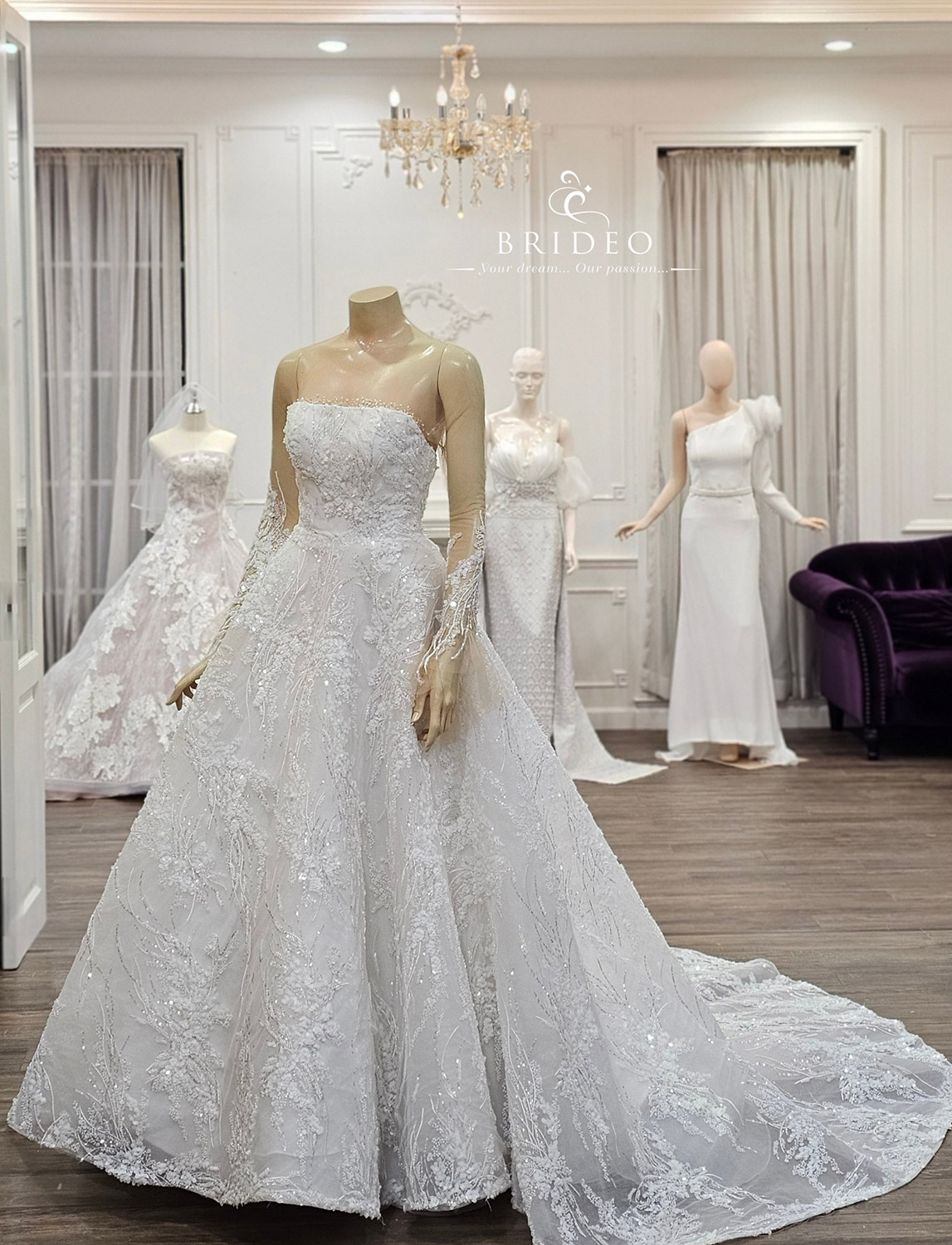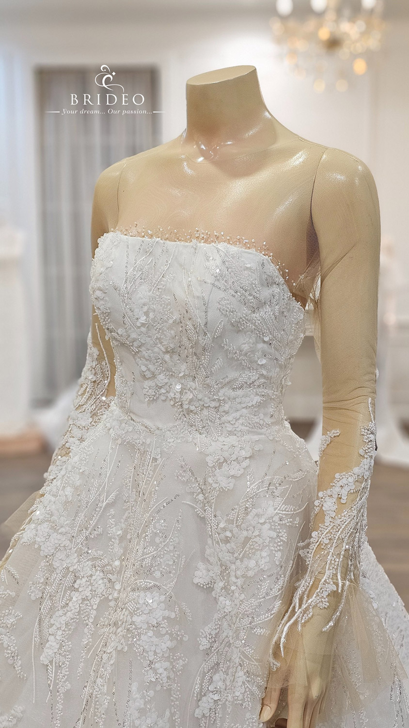 ชุดแต่งงาน ทรง ball gown princess ลวดลายหวาน ปักเลื่อมเล่นแสงระยิบระยับ ทรงกระโปรงสวย ก้าวเดินได้สง่างาม…เกาะอกทรงตัดตรง เพิ่มความอวบอิ่ม อวดอกได้รูป พร้อมเสริมความมั่นใจด้วยซีทรูโปร่งแนบผิวไร้ตะเข็บใดๆ ให้ความรู้สึกราวกับ glister เลื่อมลูกปัดเกาะลอยกับเนื้อ มี detail ปลายแขนลูกปัดลายเส้นอ่อนช้อยหรูหรา…แบบชุดแนะนำสำหรับเจ้าสาวทุกรูปร่าง สามารถใส่ได้งดงามทุก ๆ ท่าน
