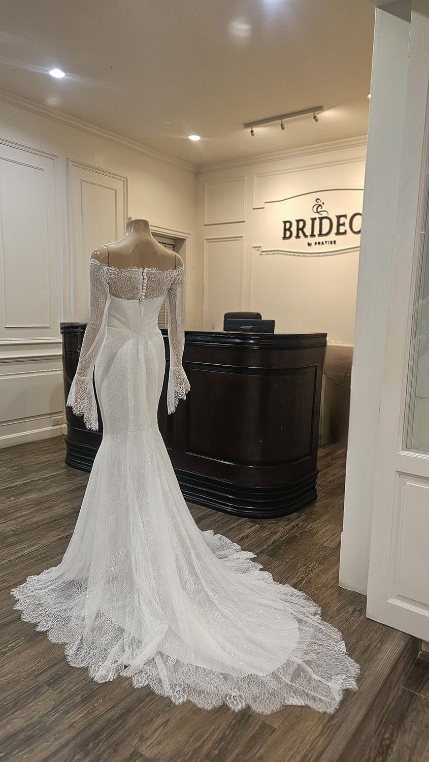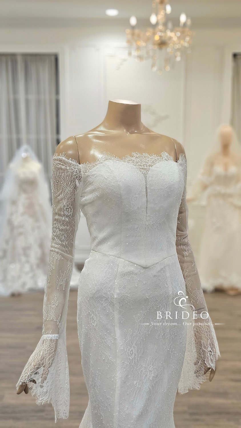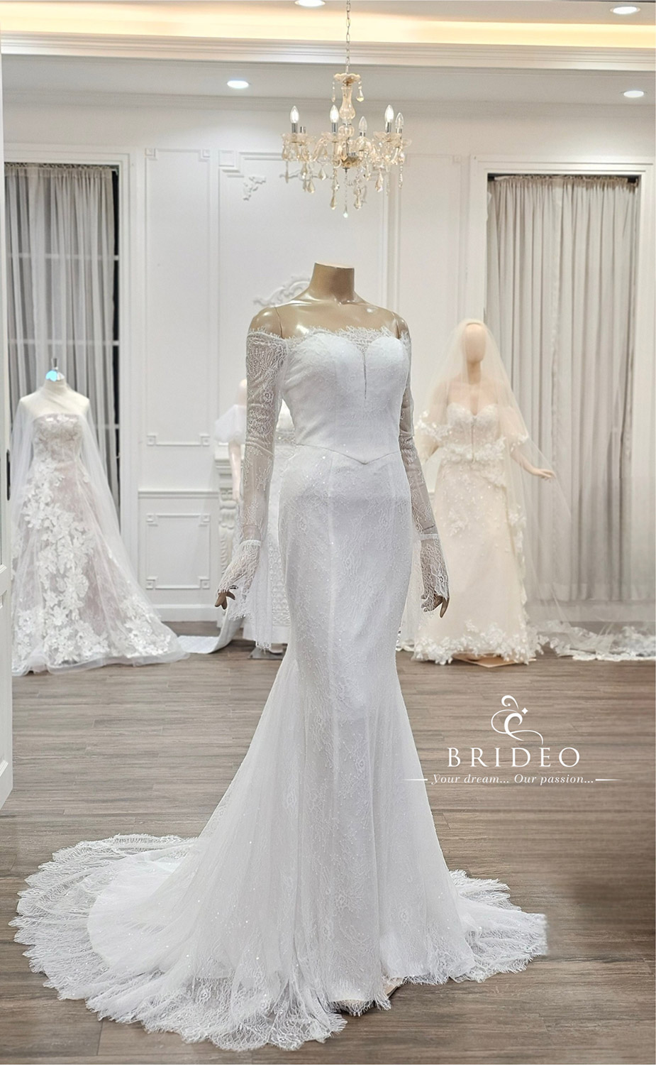 ชุดแต่งงานทรง mermaid สีขาวบริสุทธิ์ เกาะอกรูปหัวใจเปิดไหล่ปาด จัดจังหวะวางลูกไม้งดงามเพื่ออวดลำคอระหงส์ ให้ลุคเจ้าสาวที่แสนบอบบางน่าทะนุถนอม พร้อม detail ปลายแขนเสื้อสุดหรูเล่นระดับเชิงลูกไม้เพื่ออวดแหวนหมั้นที่ปลายนิ้วนาง แพทเทริ์นกระโปรง mermaid สวย คัทติ้งหวานอวด curve ก้นด้านหลัง ทำให้เจ้าสาวสวยหรูจับตาในทุก ๆ มุมมอง (แม้เจ้าสาวช่วงบนอวบน้อยๆ ที่คอ, แขนไม่เรียวยาว สามารถเลือกไปใช้เพื่อให้ได้ลุคโปร่งบาง)