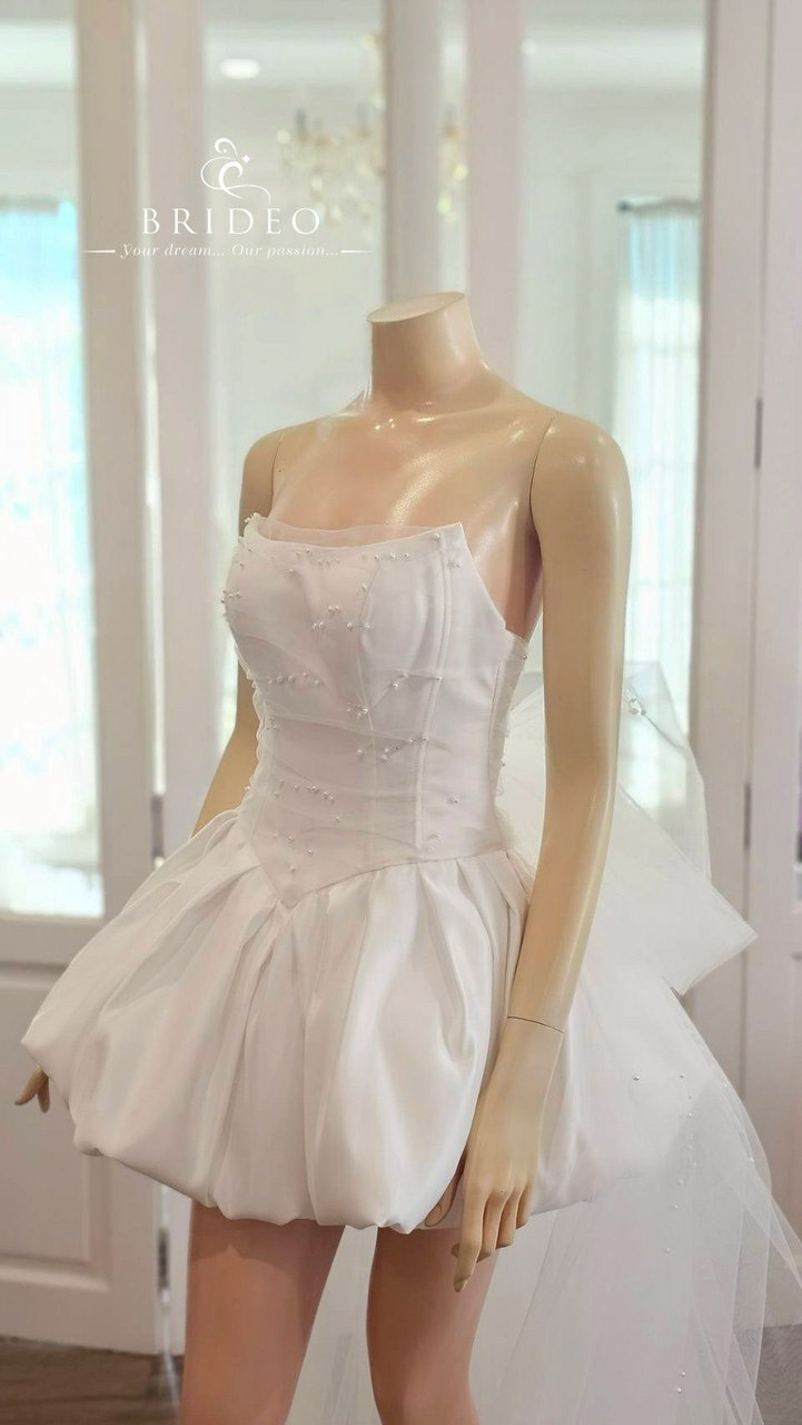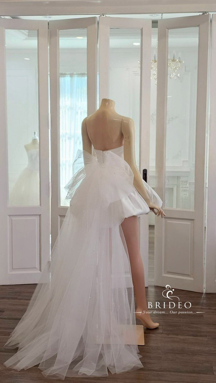 หวานจากเดรปผ้า tulle จับริ้วช่วงอก ขมวดเป็นโบว์ใหญ่ปักประดับเลื่อมเป็นจังหวะหวานทอดหางยาว