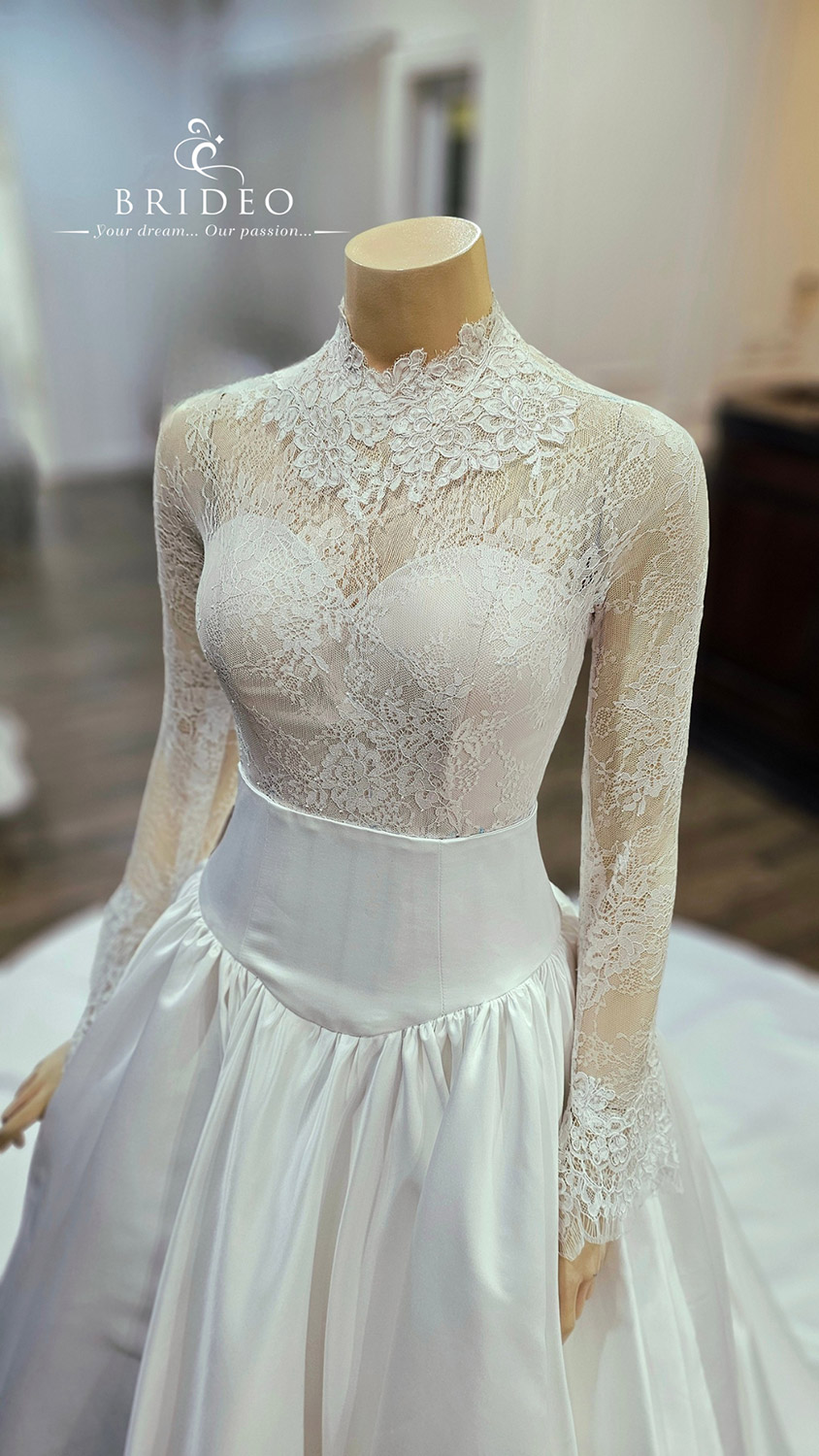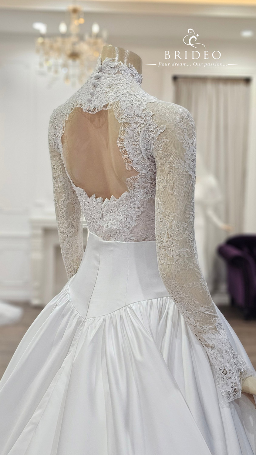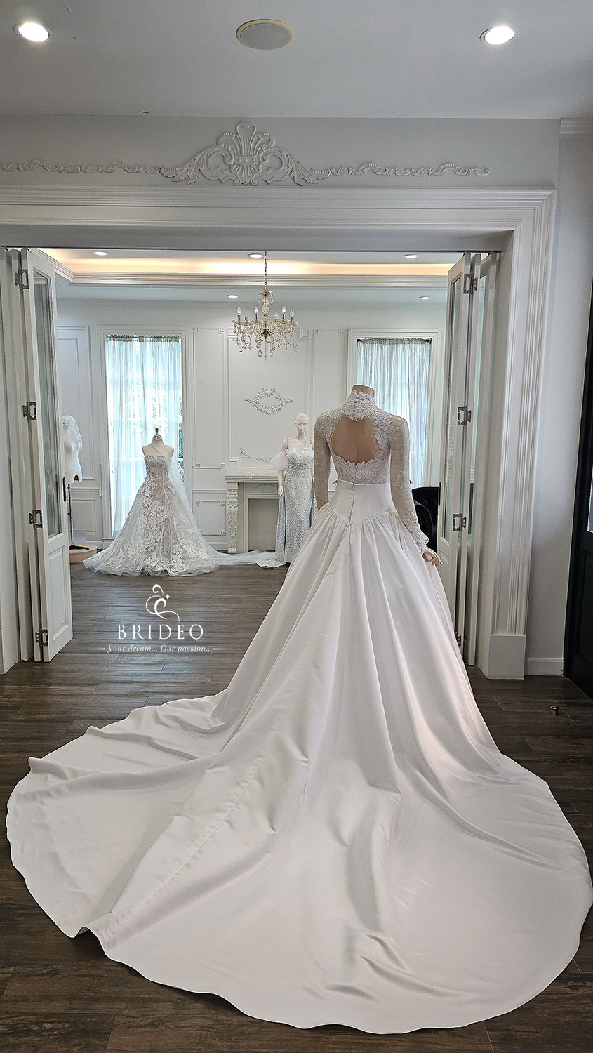 ชุดเจ้าสาวสำหรับงานแต่งในพิธีเข้าโบสถ์ ชุดแต่งงานประดับด้วยการวางลูกไม้ฝรั่งเศสในจังหวะงดงาม เกาะอกคัทติ้งรูป sweet heart รับกับกระโปรงเอวสูง อวดหุ่นนาฬิกาทราย พร้อมตบแต่งรายละเอียดปลายแขนและการเซาะวางลูกไม้ที่ด้านหลังสุดแสนวิจิตรบรรจงเพื่อพิธีการสวมแหวนแต่งงานที่งดงามหรูเรียบโก้