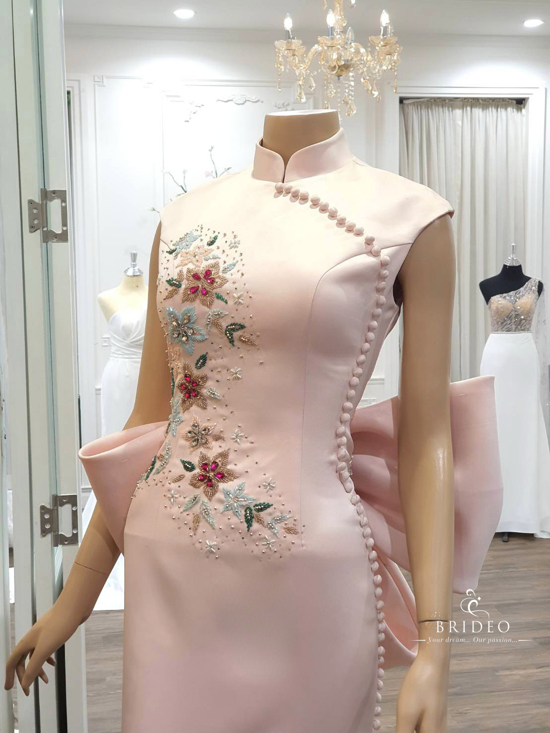 ชุดหมั้นสำหรับเจ้าสาวพิธียกน้ำชา minimal เรียบหรู ชุดแต่งงานตัดเย็บด้วยผ้ารอยัลดัชเชิสเนื้อดีสีหวาน ชมตาเปล่าสวยหรูมาก เนื้อผ้านิ่มคัทติ้งสวยสวมใส่สบาย ให้ความรู้สึกหวานพิเศษ ในวันแต่งงาน ชุดหมั้นปักประดับด้วยคริสตอลสี เขียนลายดอกไม้ ปักกระจายด้วยเลื่อมทองคุณภาพสูง เส้นสายสวยด้วยกระดุมปั๊ม handmade  สวยเลอค่า ในวันรับสินสอดราคาแพง