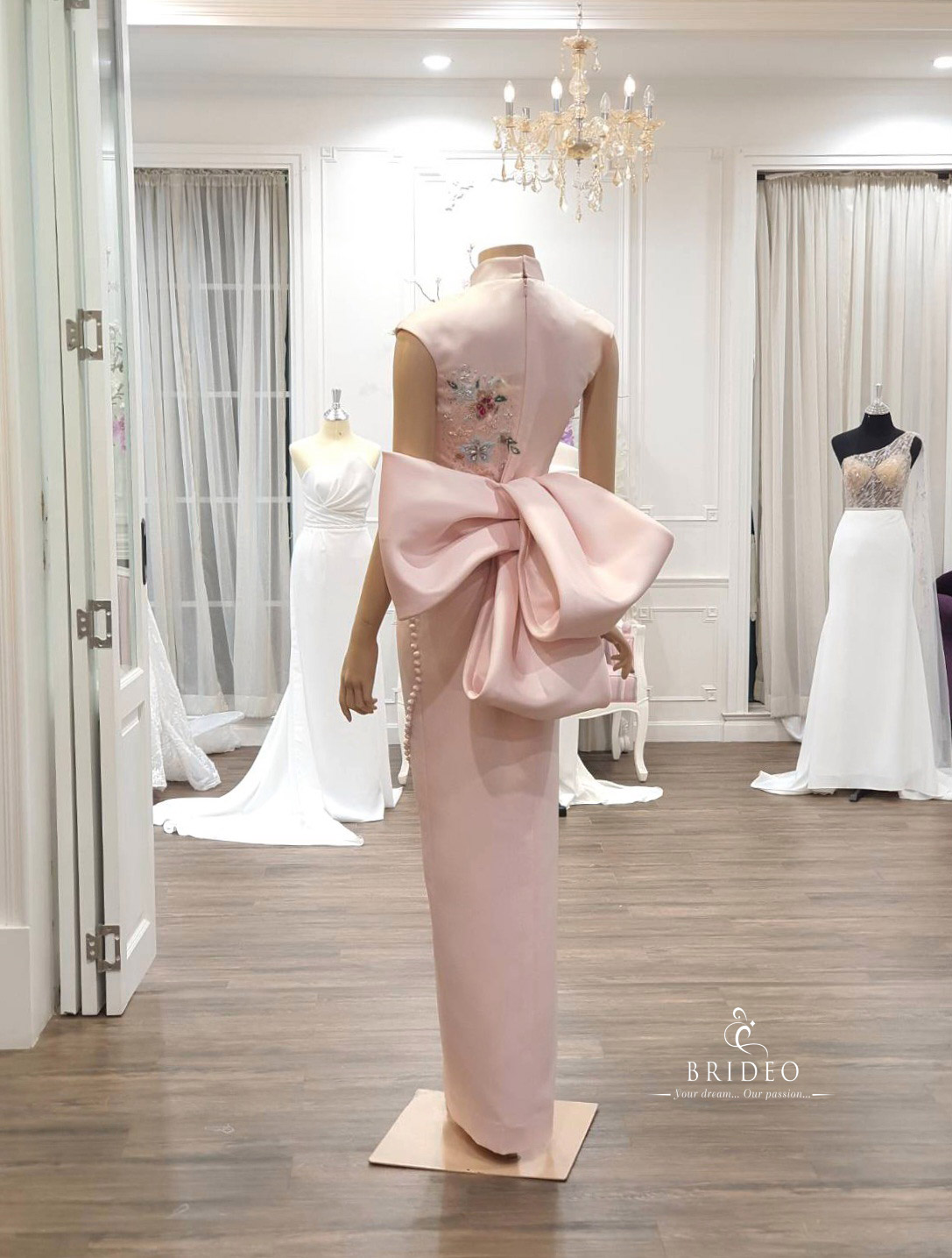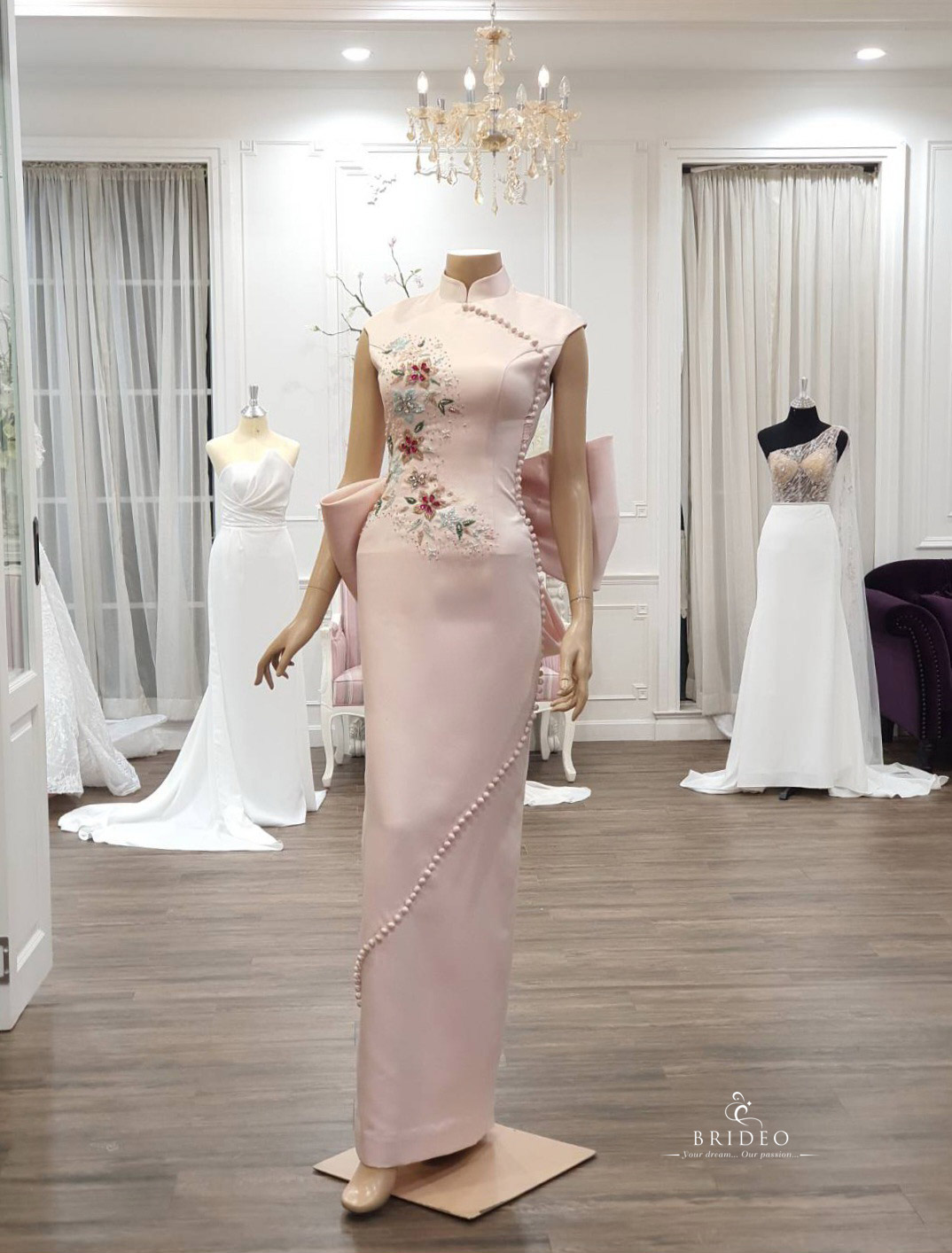 ชุดหมั้นยกน้ำชาตัดเย็บปราณีตสำหรับเช่า พร้อมบริการปรับ size พิถีพิถัน อวดเอวคอดและ เส้นอกสวยของเจ้าสาว ความยาวสามารถปรับได้