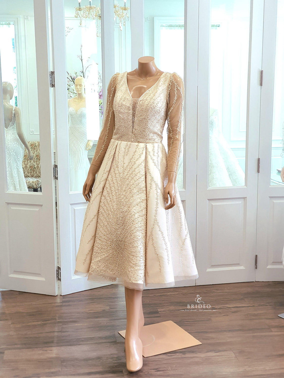 ชุดหมั้นสำหรับพิธียกน้ำชา สีทองครีมละมุน งดงามเป็นมงคลถูกใจญาติผู้ใหญ่ (size XL, XXL) ช่วงอกคัทติ้งสวยโปร่งบางด้วยเส้นผ่าแนวกลางอก พร้อมปักคริสตอลพลางหลอกตา