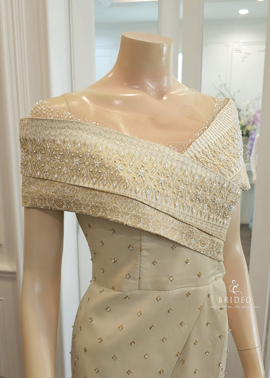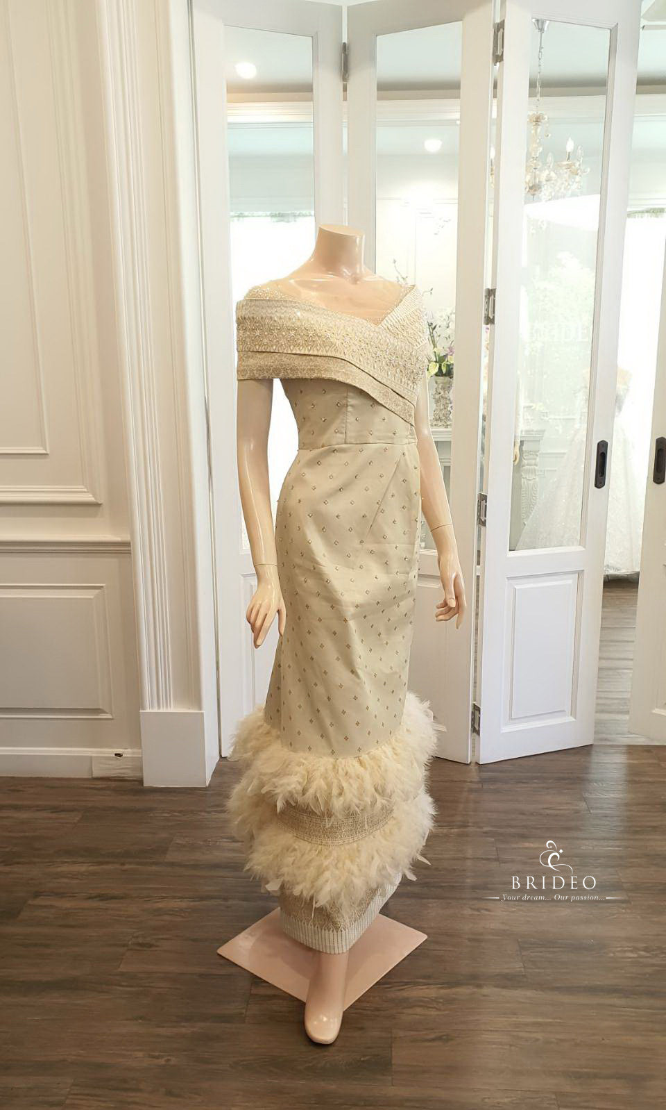 ชุดไทยประยุกต์ design สวยเรียบหรู จับเดรปโอบไหล่ด้วยเชิงผ้าลายไทย วางบนผ้าซีทรูปักเลื่อมคริสตอลเนื้อช่วงลำคอ เชิงกระโปรงตบแต่งด้วยขนนกสีเนื้อนวล สำหรับใช้ในงานเลี้ยงบ่งบอกความเป็นไทยละเอียดละออ สวยเปล่งประกายจับตา