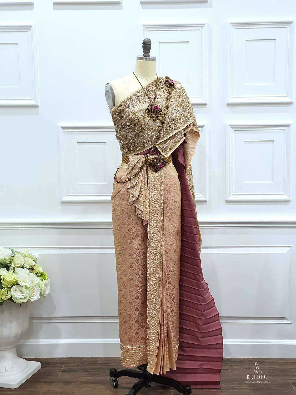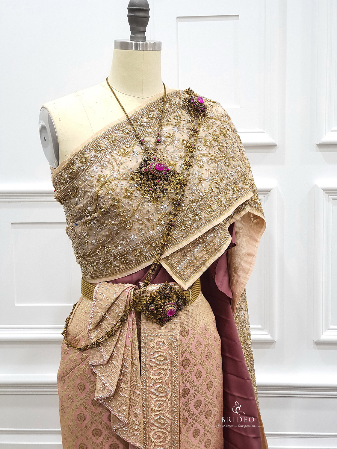 ชุดไทย ไหล่เฉียง เรียบหรู ราคาเช่าพร้อมปรับ size ปราณีต โดยช่างแก้มืออาชีพและเครื่องประดับ