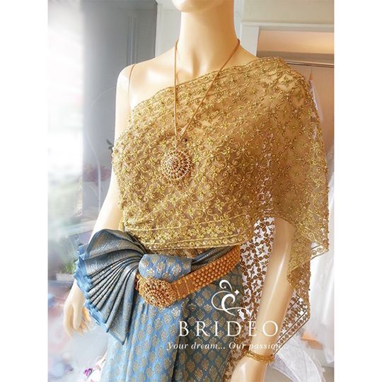 ชุดไทยสไบปักแน่น สีฟ้าอมเขียว
