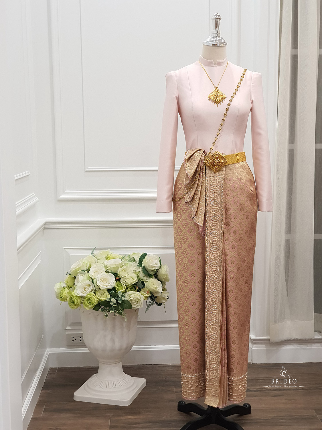 ชุดไทยบรมพิมานสีสุภาพ พร้อมเทคนิคตัดเลียนแบบผ้าถุงนุ่งสด ชายพกพริ้ว ๆ หน้านางทิ้งตัวริ้ว ๆ เจ้าสาวเดินสวย สวมใส่สะดวก สามารถใช้ในงานสมรสพระราชทานได้ (ด้านหลังกระโปรงไม่มีรอยผ่าแยก)
