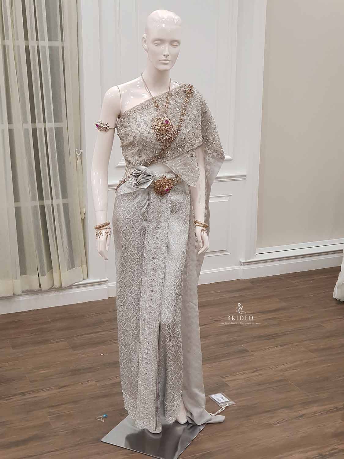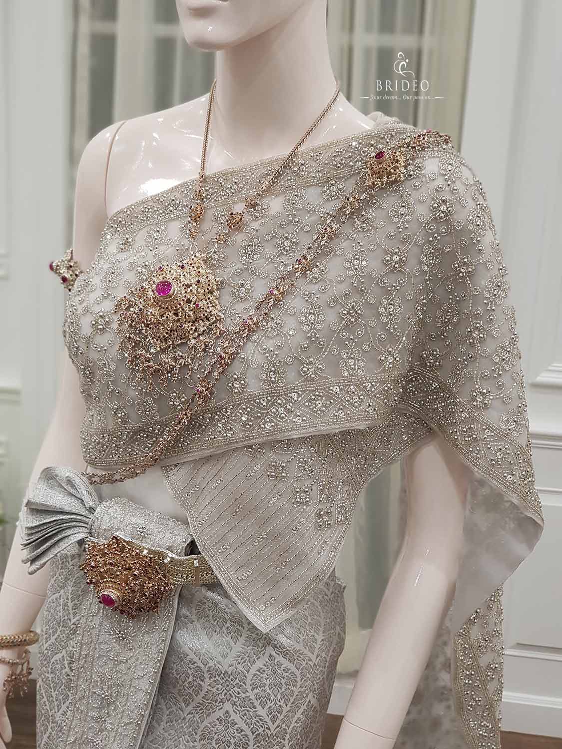 ชุดไทยสีเทาขาว สไบปักสวย หรู เรียบ โก้ พร้อมบริการปรับ size ปราณีต และเครื่องประดับ