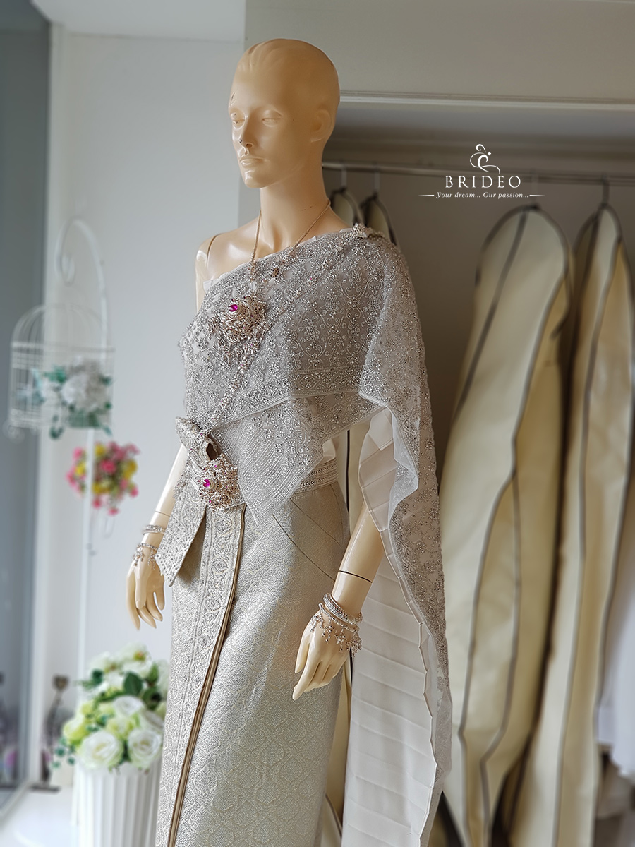 ชุดไทย สไบเงิน นุ่งทับผ้าถุงครีมทอง หรู หวาน เลอค่า (เช่าพร้อมบริการปรับ size ปราณีตและเครื่องประดับ) เทคนิคตัดเย็บสำเร็จผ้านุ่งสวมใส่สะดวกและสไบกลึงติดตัว ไม่ทิ้งเป็นภาระให้ช่างแต่งหน้า