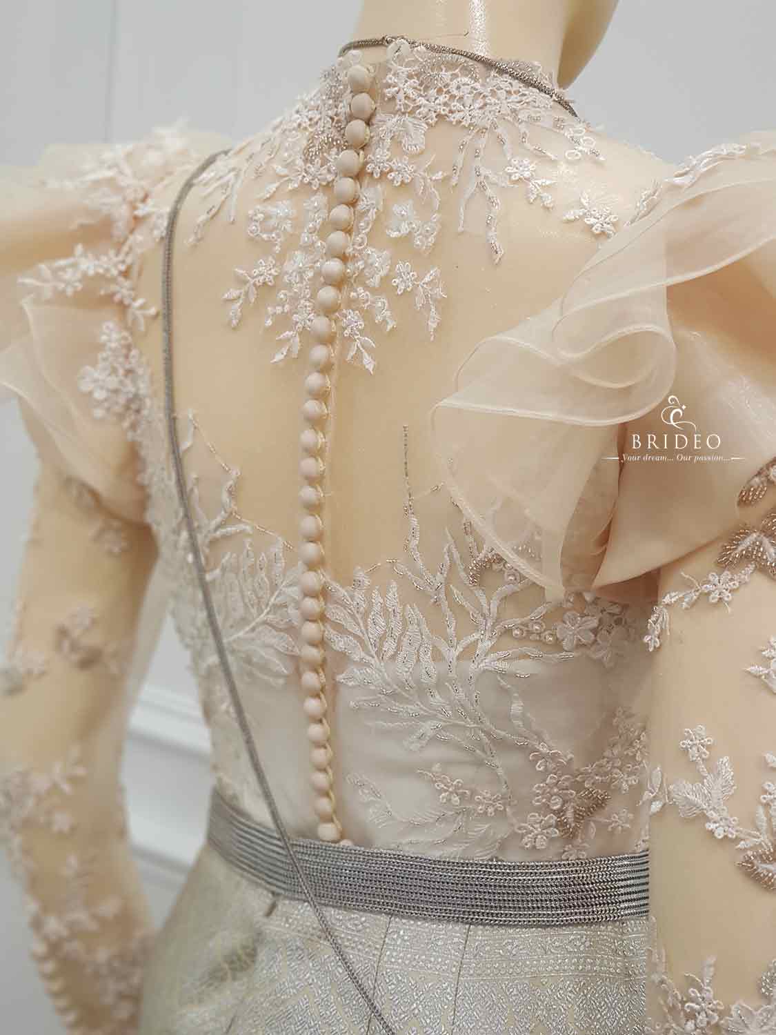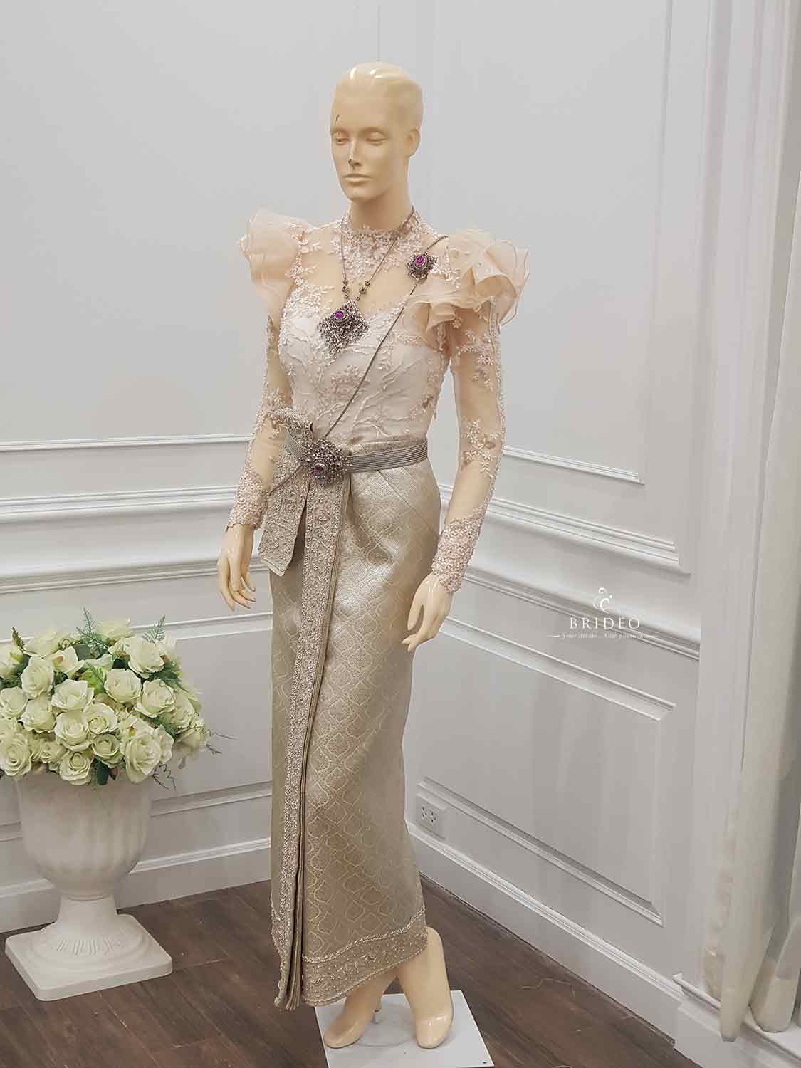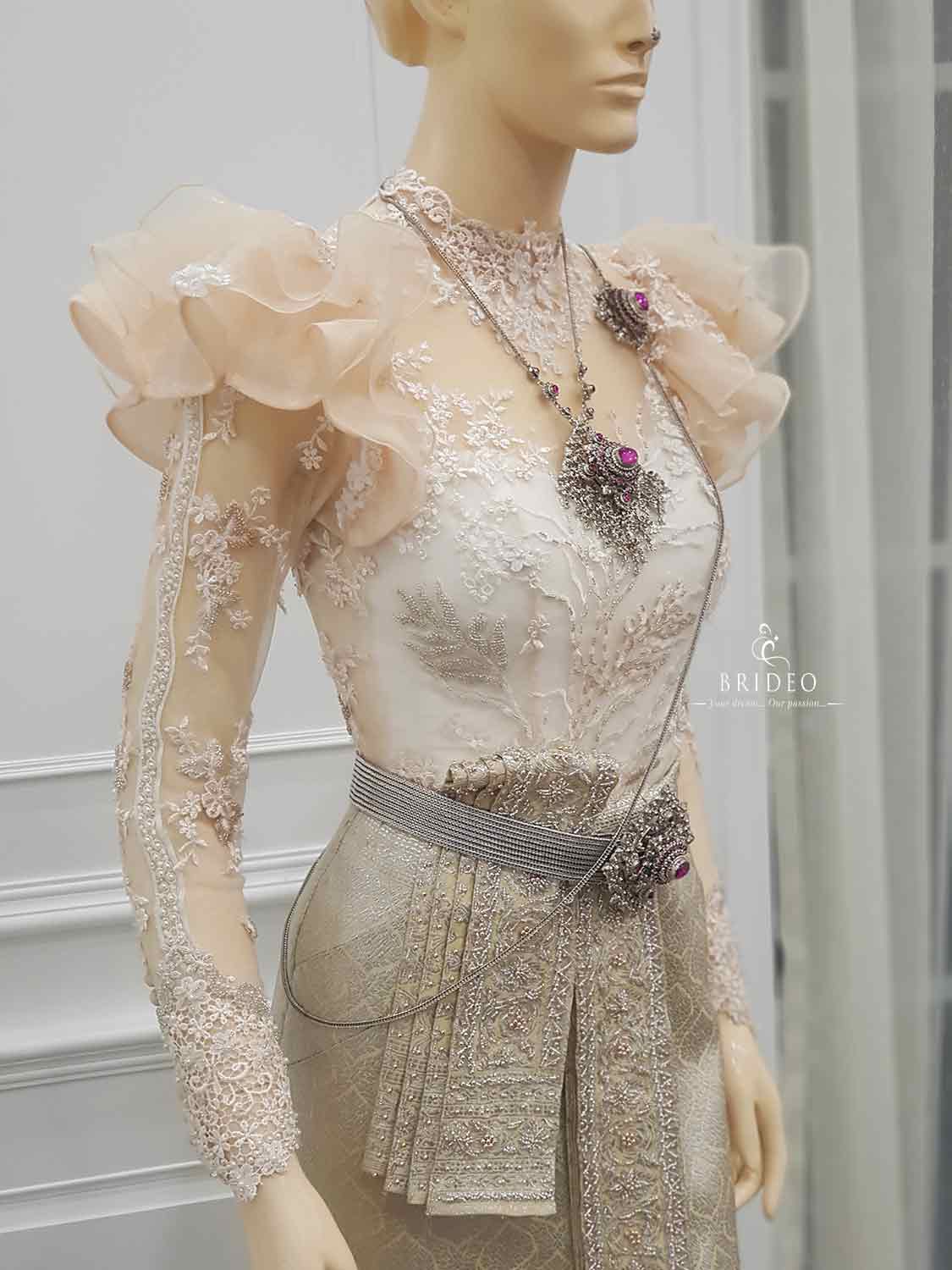 ชุดไทยบรมพิมานลูกไม้ งดงาม (คอสูง) แนะนำสำหรับว่าที่เจ้าสาวคอยาว เช่าพร้อมบริการปรับ size ปราณีตและเครื่องประดับ