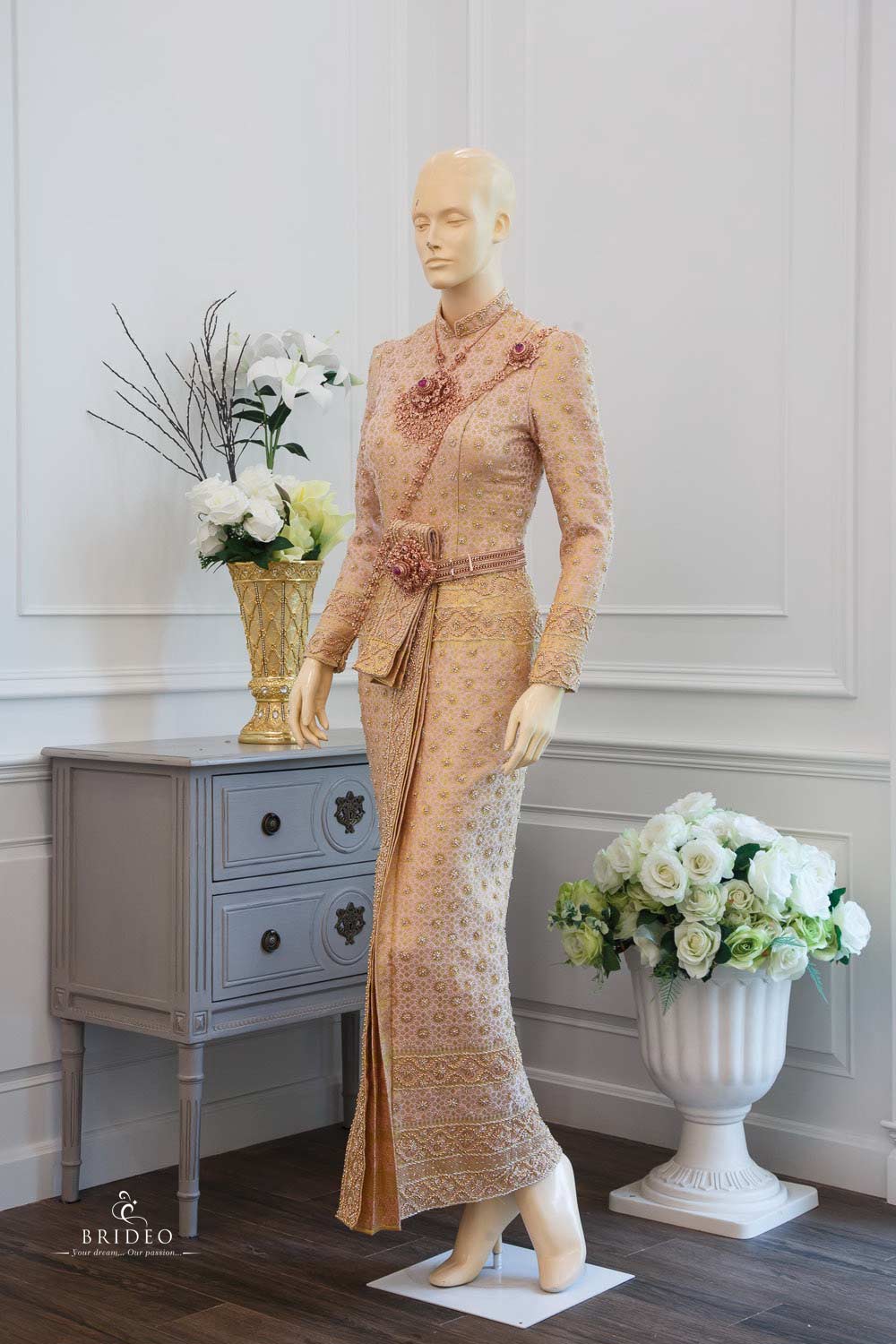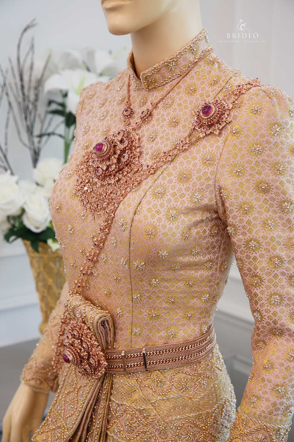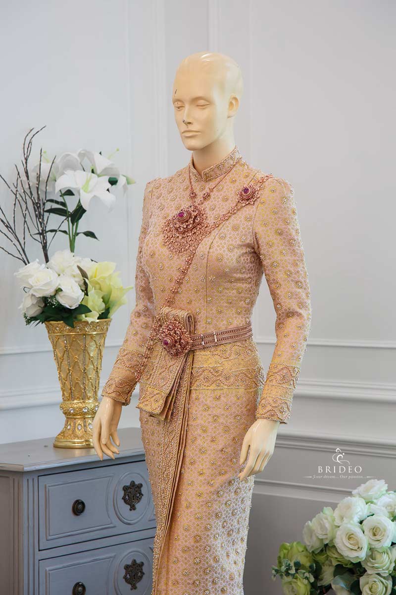 ชุดไทยบรมพิมานชมพูทองปักเลื่อม สี rose gold พร้อมบริการปรับ size ปราณีตและเครื่องประดับไทยโบราณ set ใหญ่ (ตามภาพ)