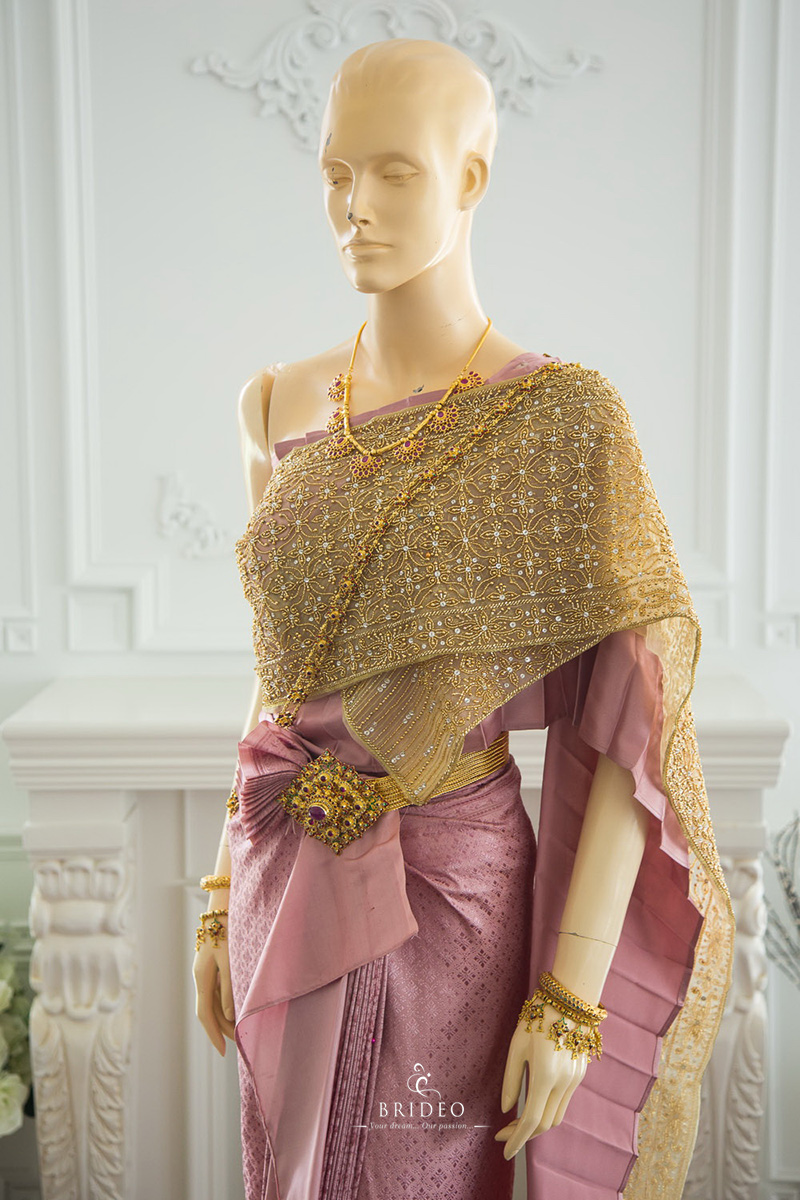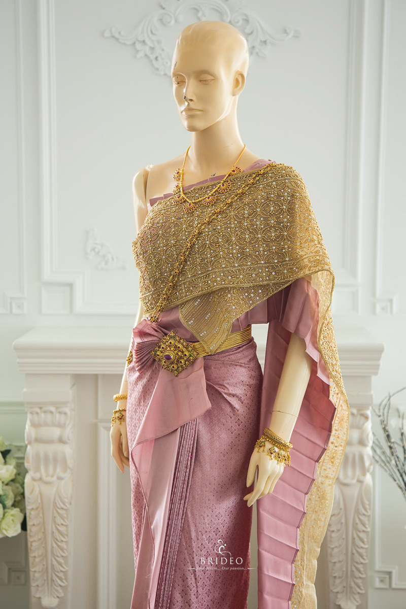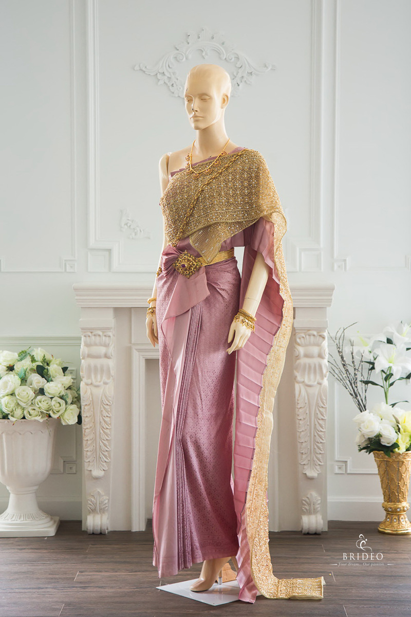 ชุดไทยสีกลีบบัวหรู ผ้านุ่งเลียนแบบนุ่งสด เช่าพร้อมบริการปรับ size ปราณีต และเครื่องประดับตรงตามภาพ