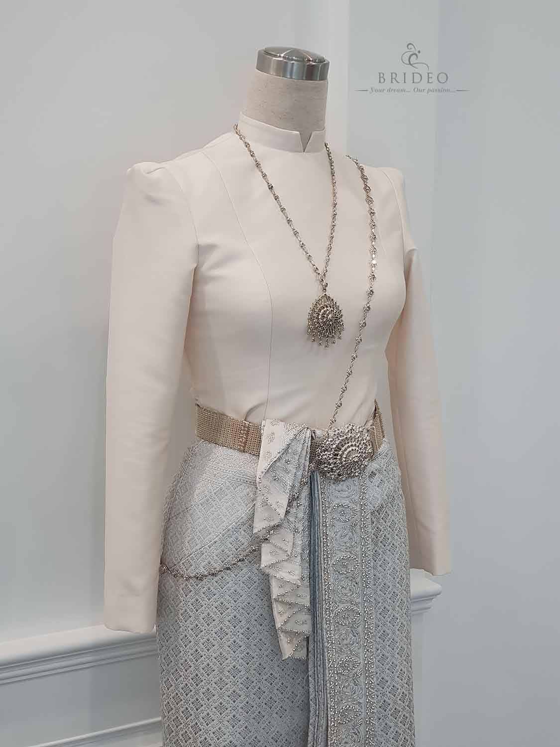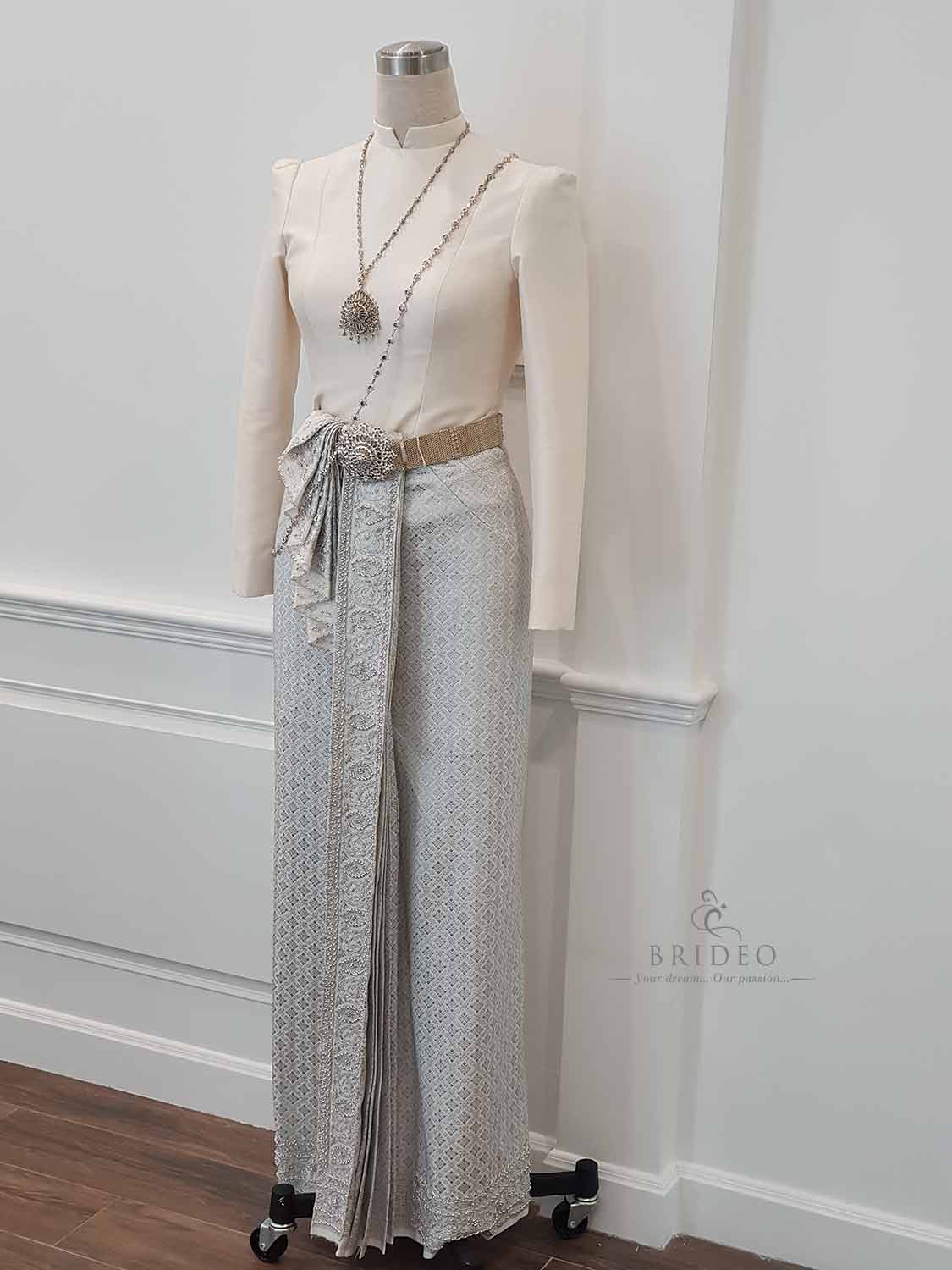 ชุดไทยบรมพิมาน หรู เรียบ โก้ สามารถนำไปใช้ในพิธีสมรสพระราชทาน (กระโปรงเรียบร้อย ตัดเย็บโดยไม่ผ่าทั้งหน้าและหลัง)