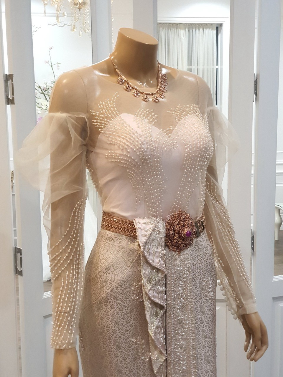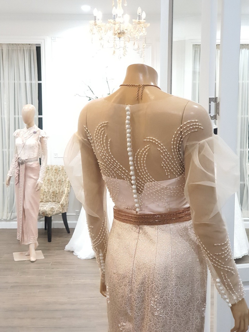 ชุดไทยสำหรับพิธีเช้า สีกลีบบัวผสมชมพูมุก ตัวเสื้อเป็นผ้า tulle วางลายปักปราณีต สวมกับผ้านุ่งสีโรสต์โกล ปักมุกอมส้ม ให้ลุคสดใส บอบบางงดงามน่าทะนุถนอม