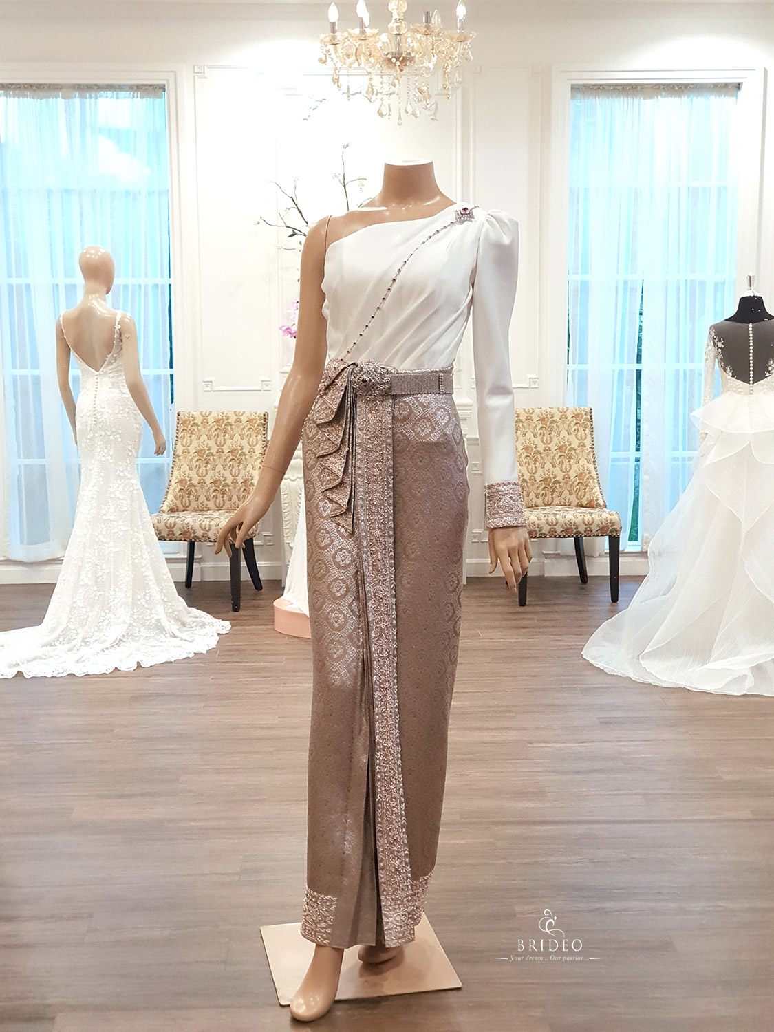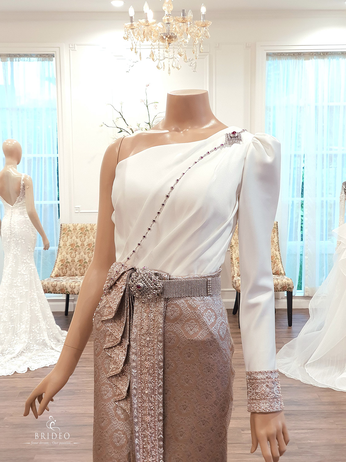 ชุดไทย หรู เรียบ โก้ ลุค น้อยแต่มาก จับเดรปเสื้อผ้าไหมลายเส้นสวย นุ่งคู่กับผ้าถุงตัดสำเร็จสวมใส่สะดวกสบาย เคลื่อนไหวได้คล่องแคล่วเหมาะใช้ในพิธีสงฆ์ ใส่บาตร รดน้ำสังข์ สีผ้านุ่งสวยประดับด้วยเลื่อมปักละเอียด พร้อมเทคนิคจับหน้าทางที่ให้ตัวพริ้ว ๆ ไหว ยิ่งเดินยิ่งสวย งดงามจับตา เพื่อนเจ้าสาวไม่แย่งซีน