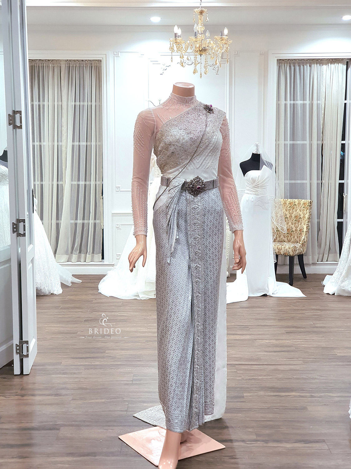 ชุดไทยสวย สง่า สำหรับเจ้าสาวมองหาลุคเรียบหรู แสนคุณหนู ไว้นั่งรับสินสอดแพง ชุดพร้อมปรับ size ปราณีต อวดซีทรูแขนคอ หลังสวย แนบเนื้อ ห่มทับด้วยสไบปักประดับเลื่อมระยับ