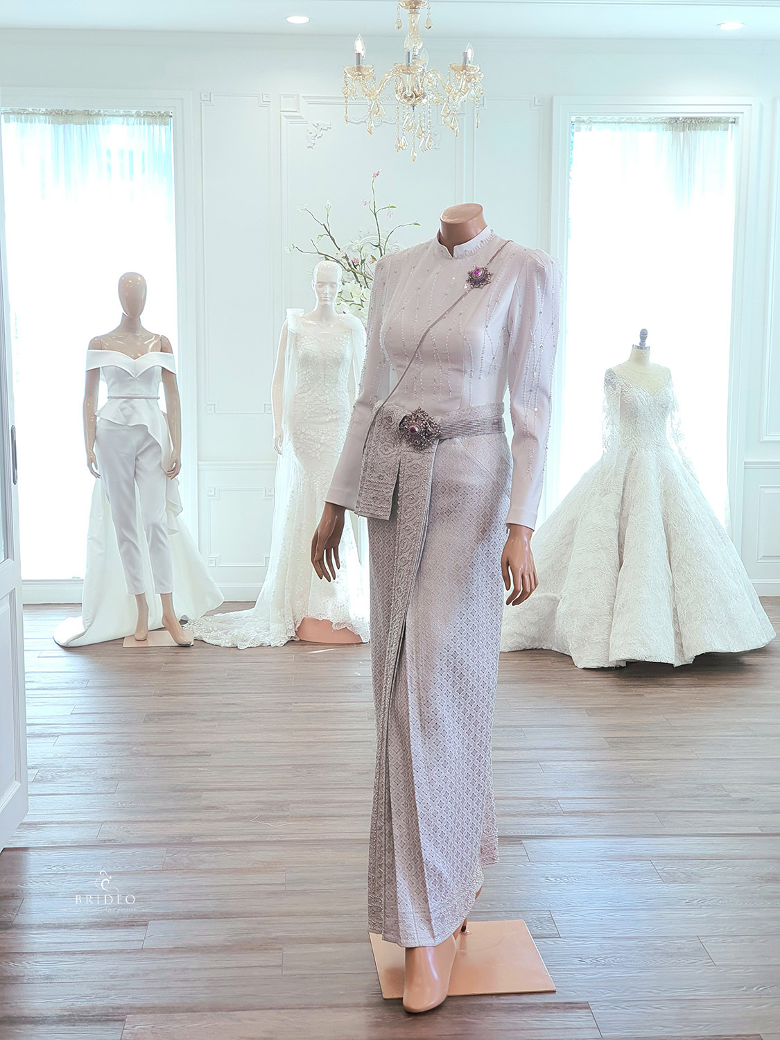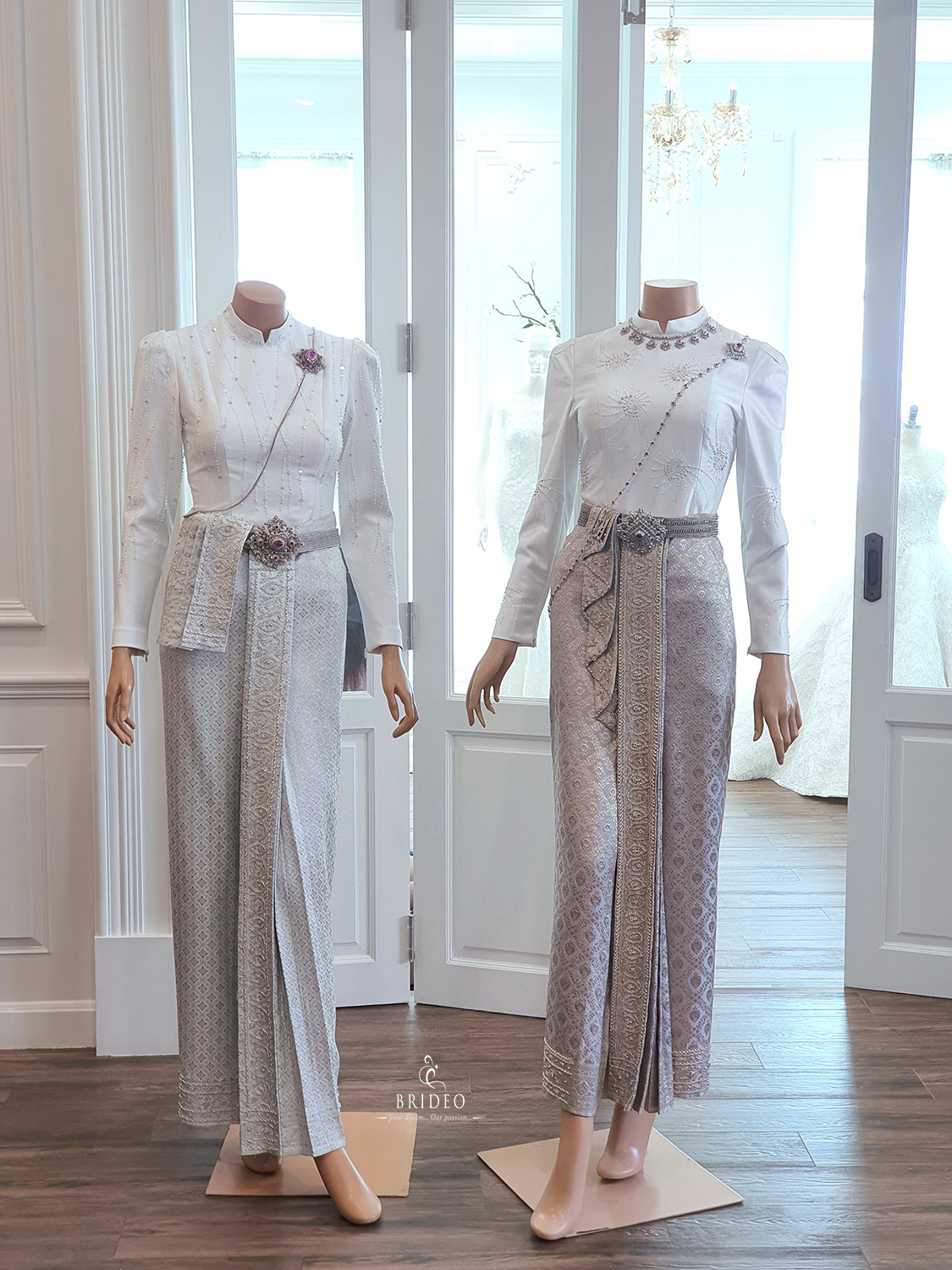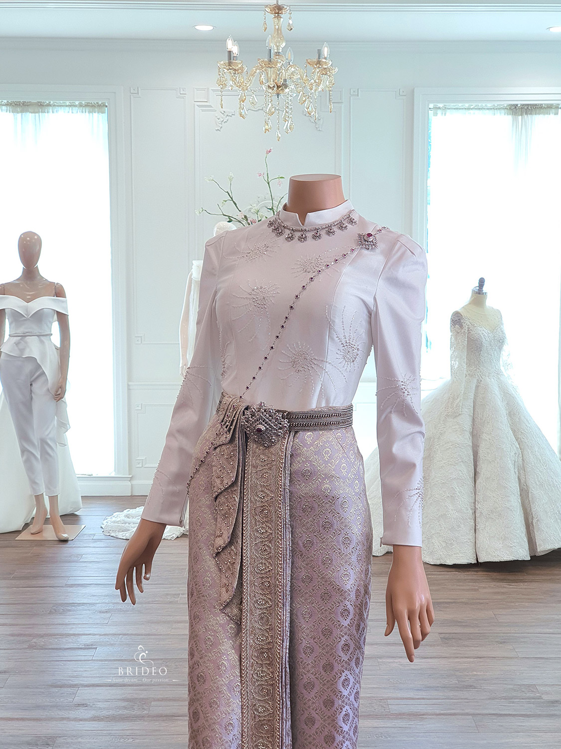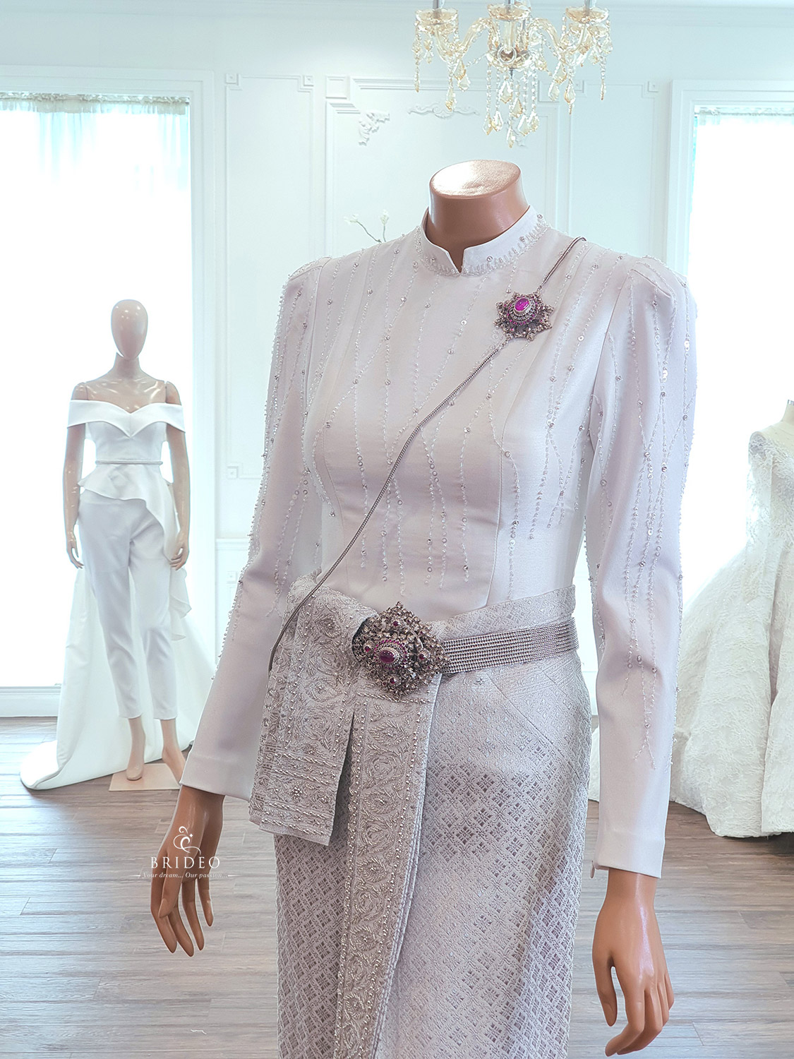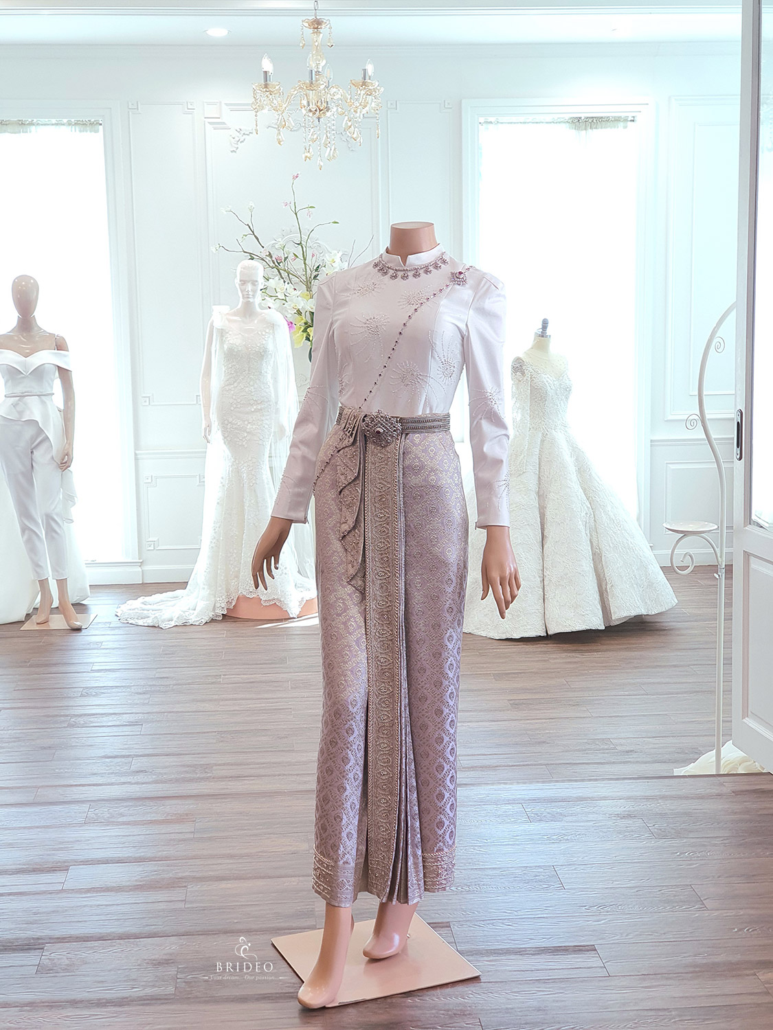 ชุดตัดประดับปราณีต สำหรับบริการเช่าพร้อมปรับ size โดยช่างแก้มืออาชีพ ผ้านุ่งประกอบสำเร็จ เจ้าสาวสวมใส่สะดวกไม่เป็นภาระให้ช่างแต่งหน้าต้องดูแล