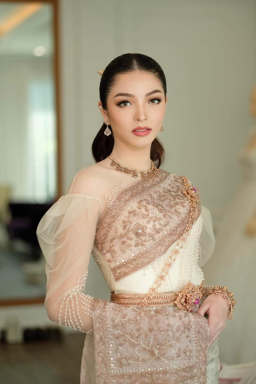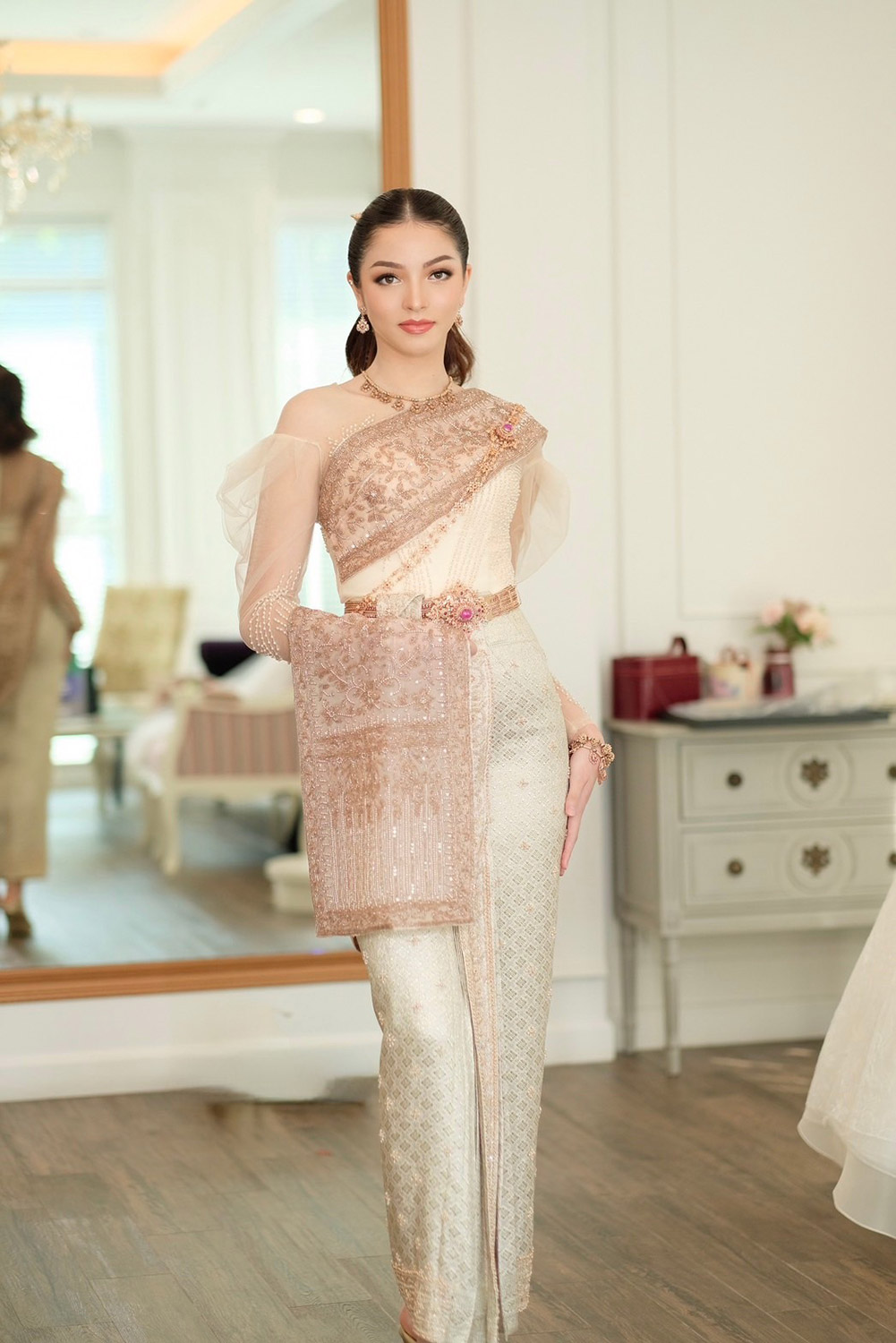 ชุดไทยบรมลูกไม้สีหวาน ลูกไม้แนบเนื้อจัดระเบียบลายสวย กระดุมปั๊มเรียงเม็ด ทับด้วยสไบเรียวเล็ก พร้อมผ้านุ่งพริ้ว ๆ ทิ้ง ๆ เจ้าสาวเดินสวยกว่าใคร ๆ สวมประดับด้วยเครื่องประดับโรสโกลต์งานมือโบราณ (ทองเหลืองแท้ไม่ใช้งานเลียนแบบพลาสติก) แสนหรูเลอค่า